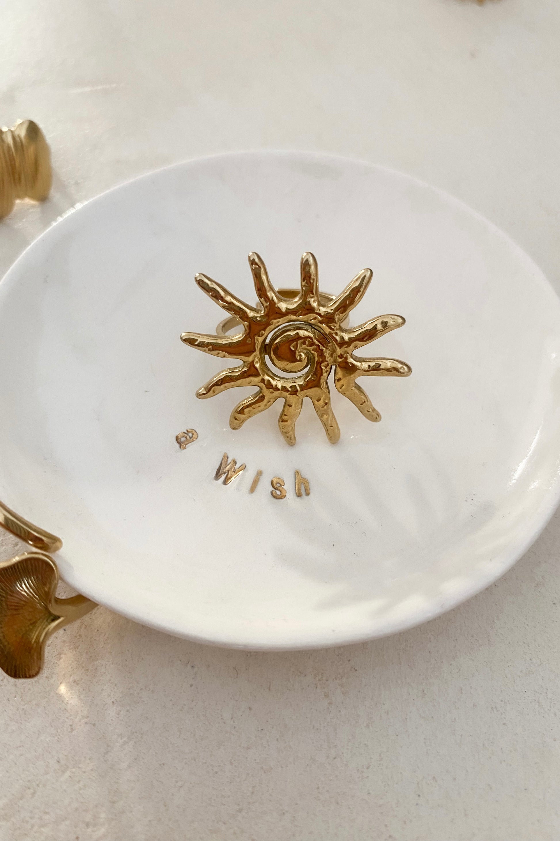 Bague dorée en acier inoxydable, élégante et originale avec sa forme solaire. Réglable, elle s’adapte facilement à toutes les tailles de doigt. Un bijou lumineux qui apporte une touche de caractère à vos looks.
