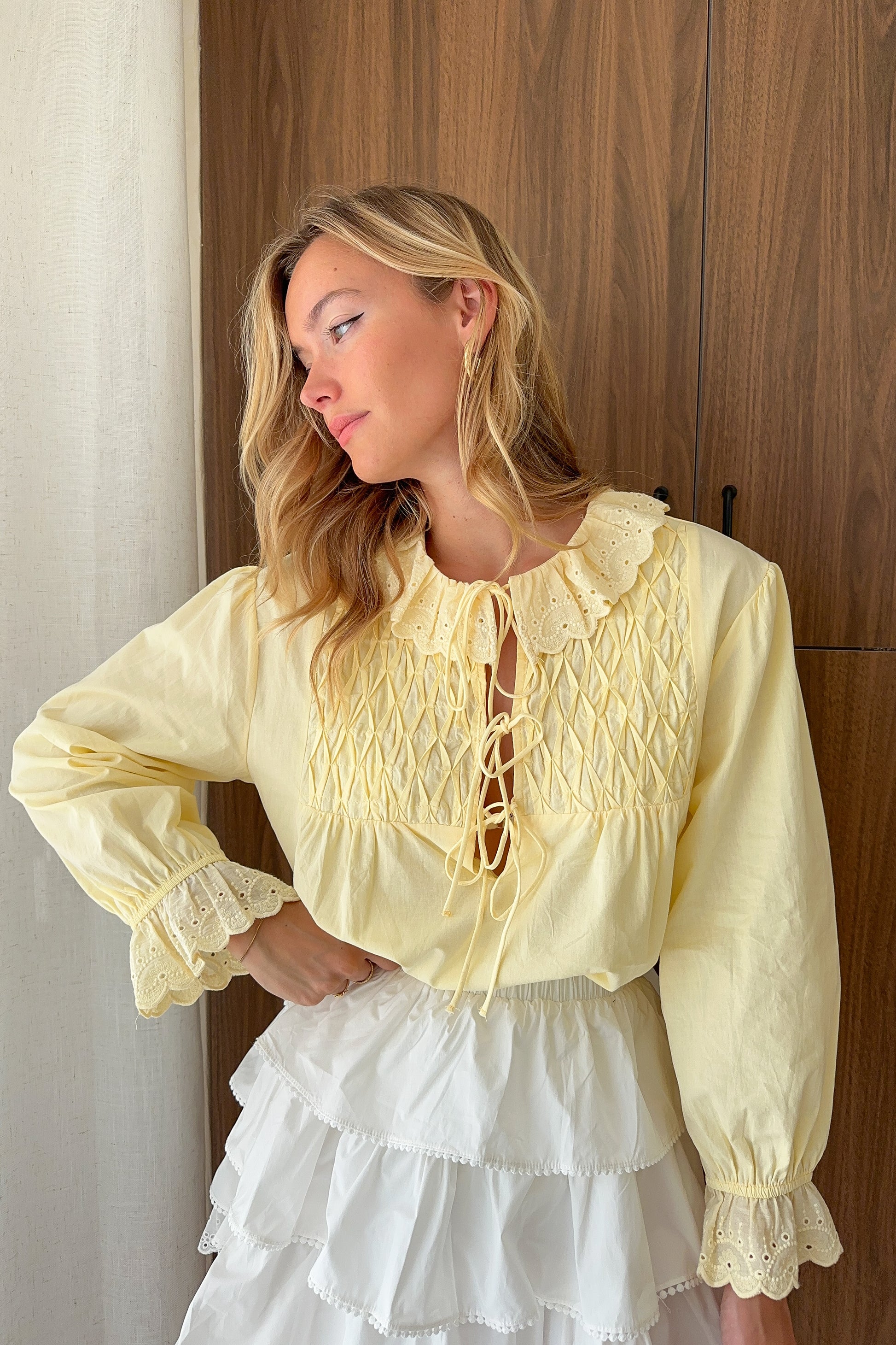 Blouse jaune au style délicatement bohème, ornée de smocks brodés sur le buste et de liens à nouer sur le devant. Les poignets et le col sont finis par des volants brodés ajourés, apportant une touche féminine et raffinée à cette pièce intemporelle.
