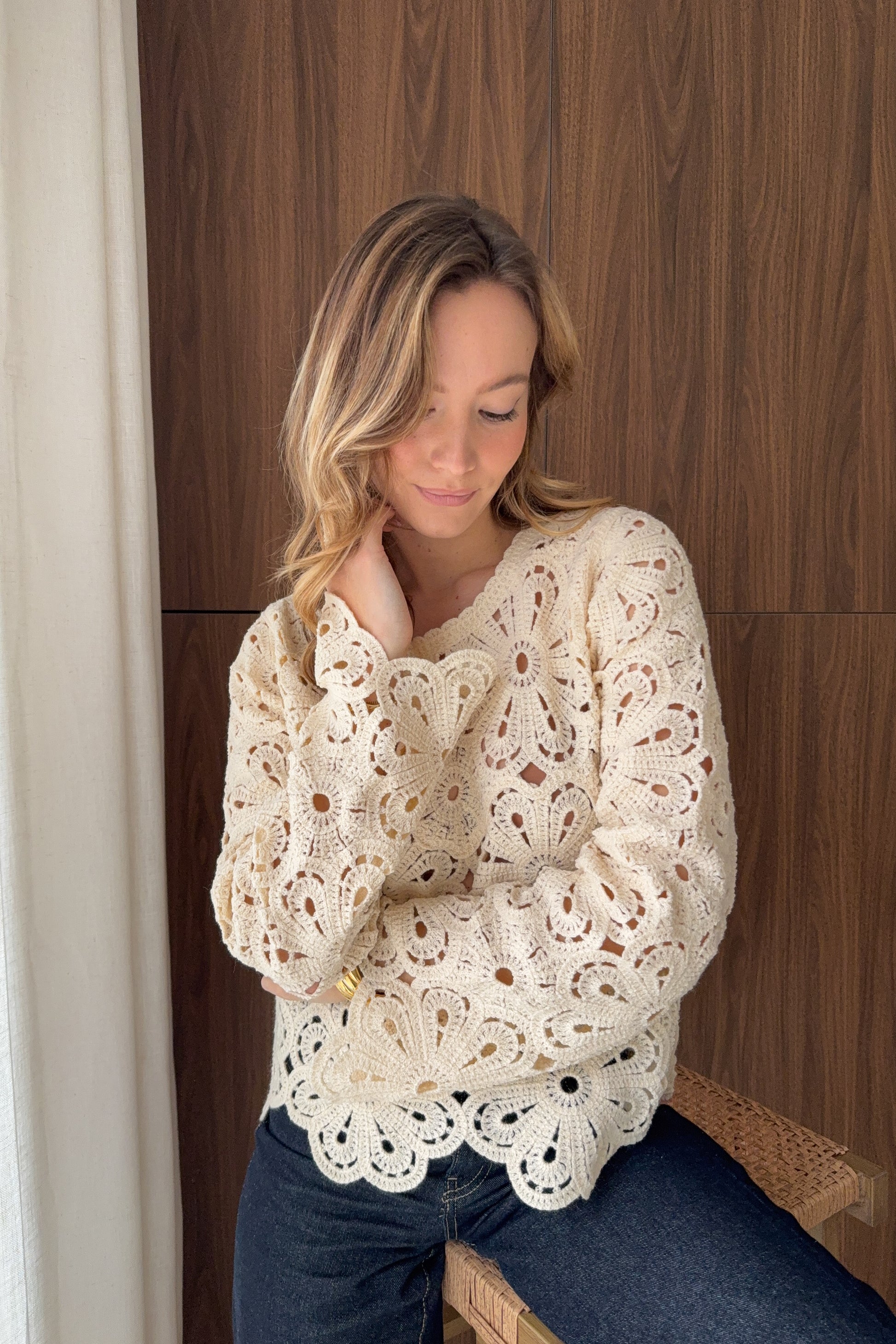 Blouse en crochet écru manches longues