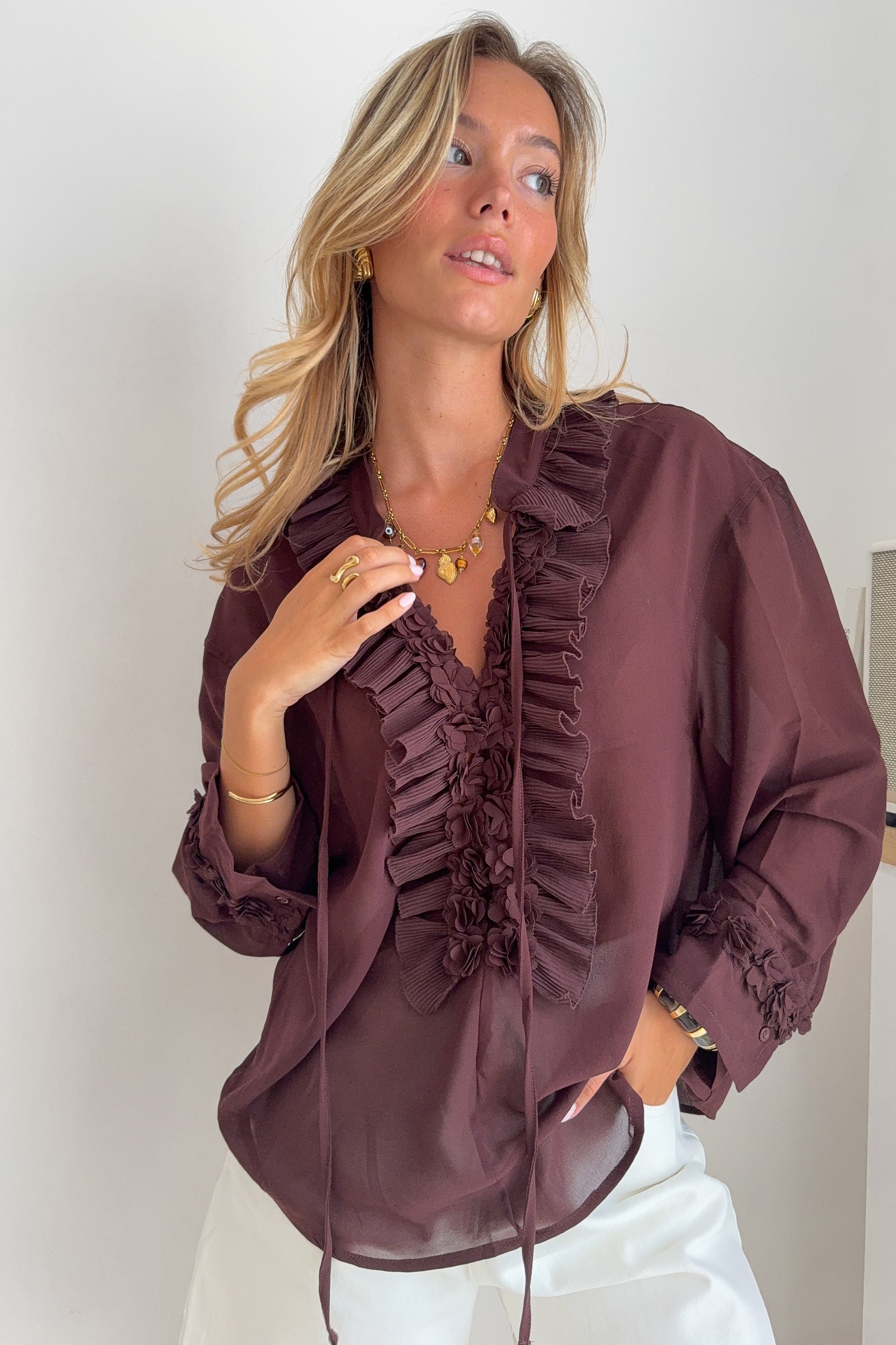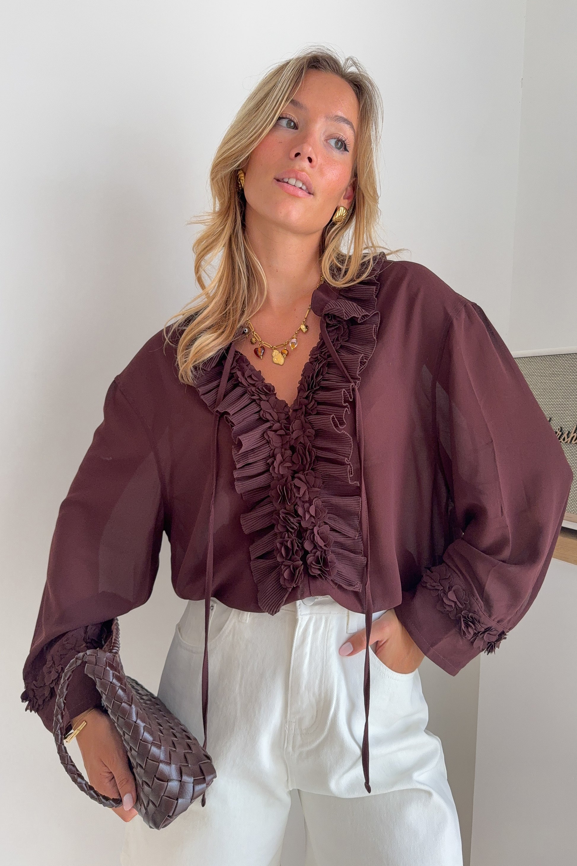 Légère et élégante, cette blouse chemisier séduit par sa coupe fluide et ses jolis détails à volants. Ses manches longues et son lien à nouer à l’encolure apportent une touche féminine et raffinée. Facile à porter, elle se marie aussi bien avec un jean décontracté qu’avec une jupe habillée.