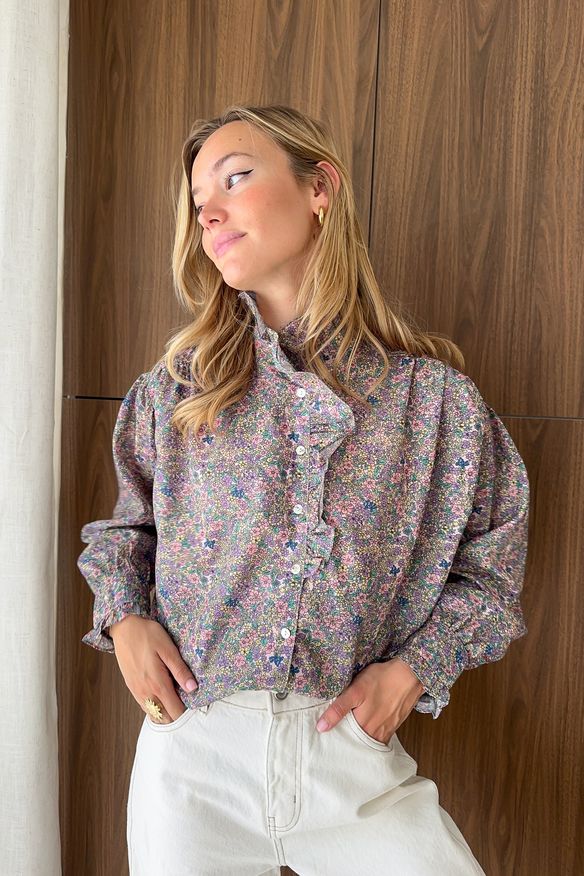 Romantique et pleine de charme, cette blouse séduit par son imprimé fleuri délicat et ses détails raffinés. Conçue dans une coupe légèrement ample et courte, elle se distingue par sa patte de boutonnage soulignée de volants et son col montant élégant. Ses manches longues bouffantes à poignets froncés ajoutent du volume et du mouvement à cette pièce pleine de douceur.