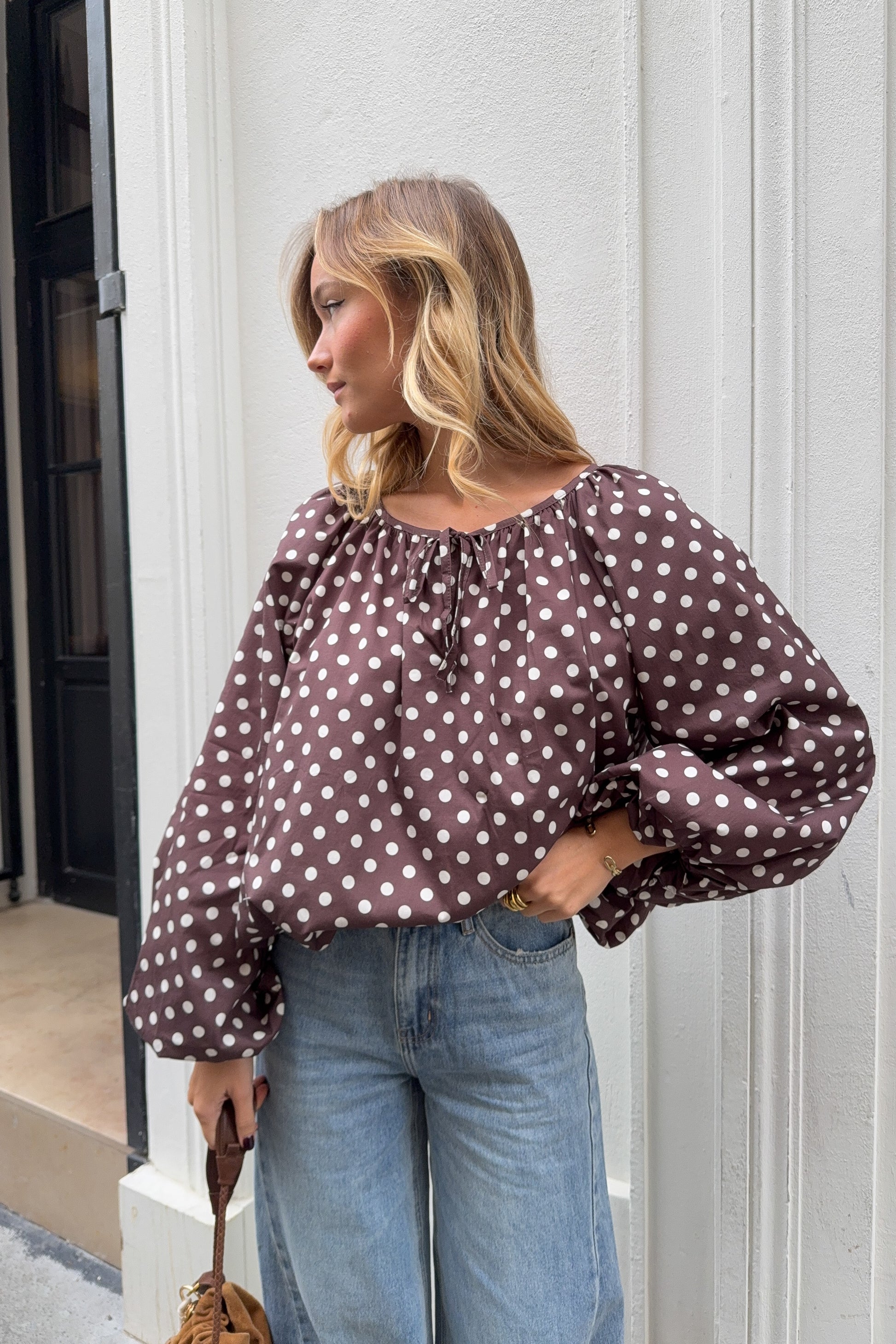 Blouse bouffante marron à pois, caractérisée par de sublimes volumes qui apportent une allure élégante et affirmée. Les manches longues conservent ce jeu de volume, tandis qu’un petit lien à nouer au niveau du col ajoute une touche délicate. Sa doublure et sa matière 100% coton la rendent agréable et confortable à porter.