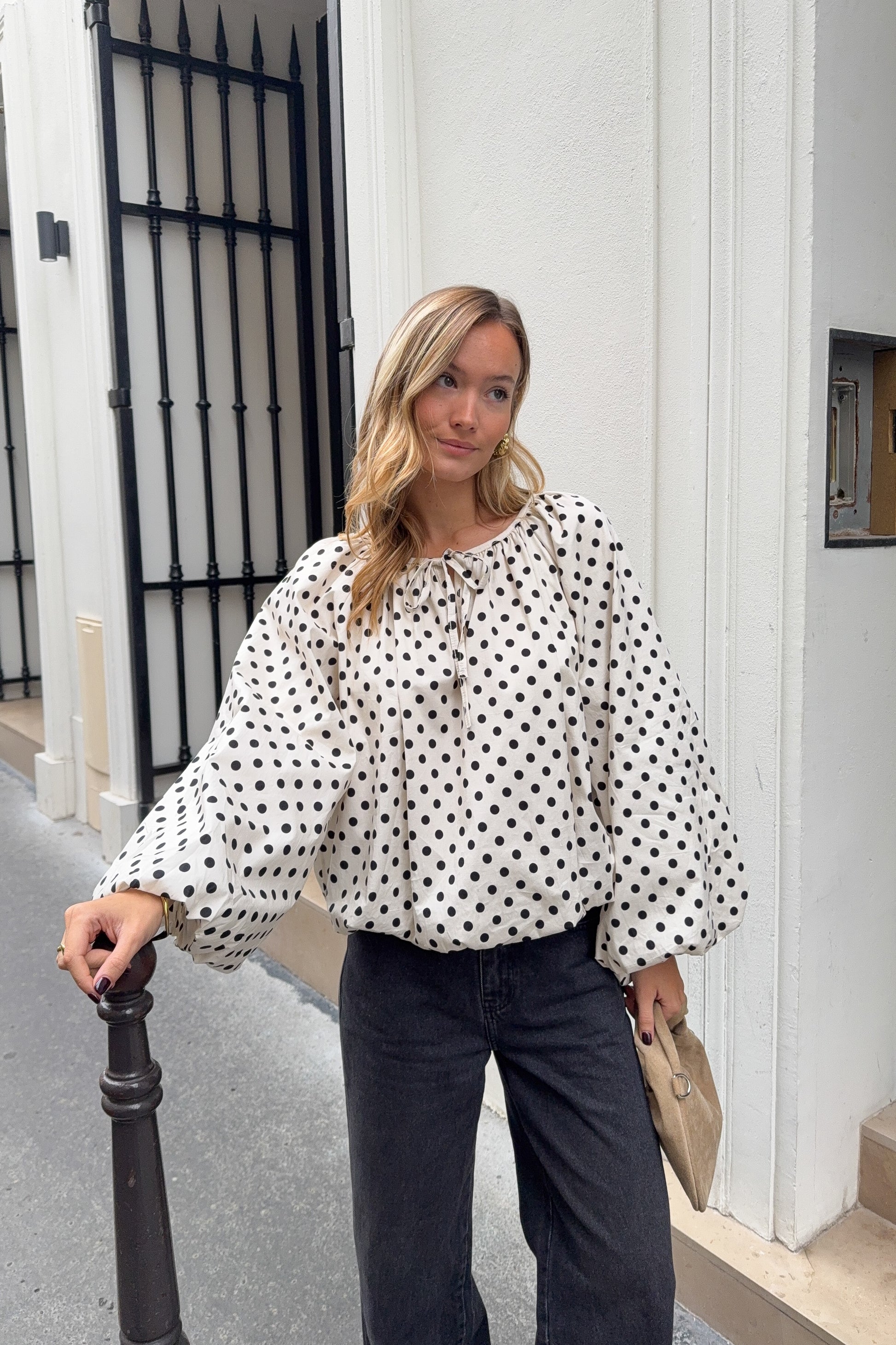 Blouse bouffante écrue à pois