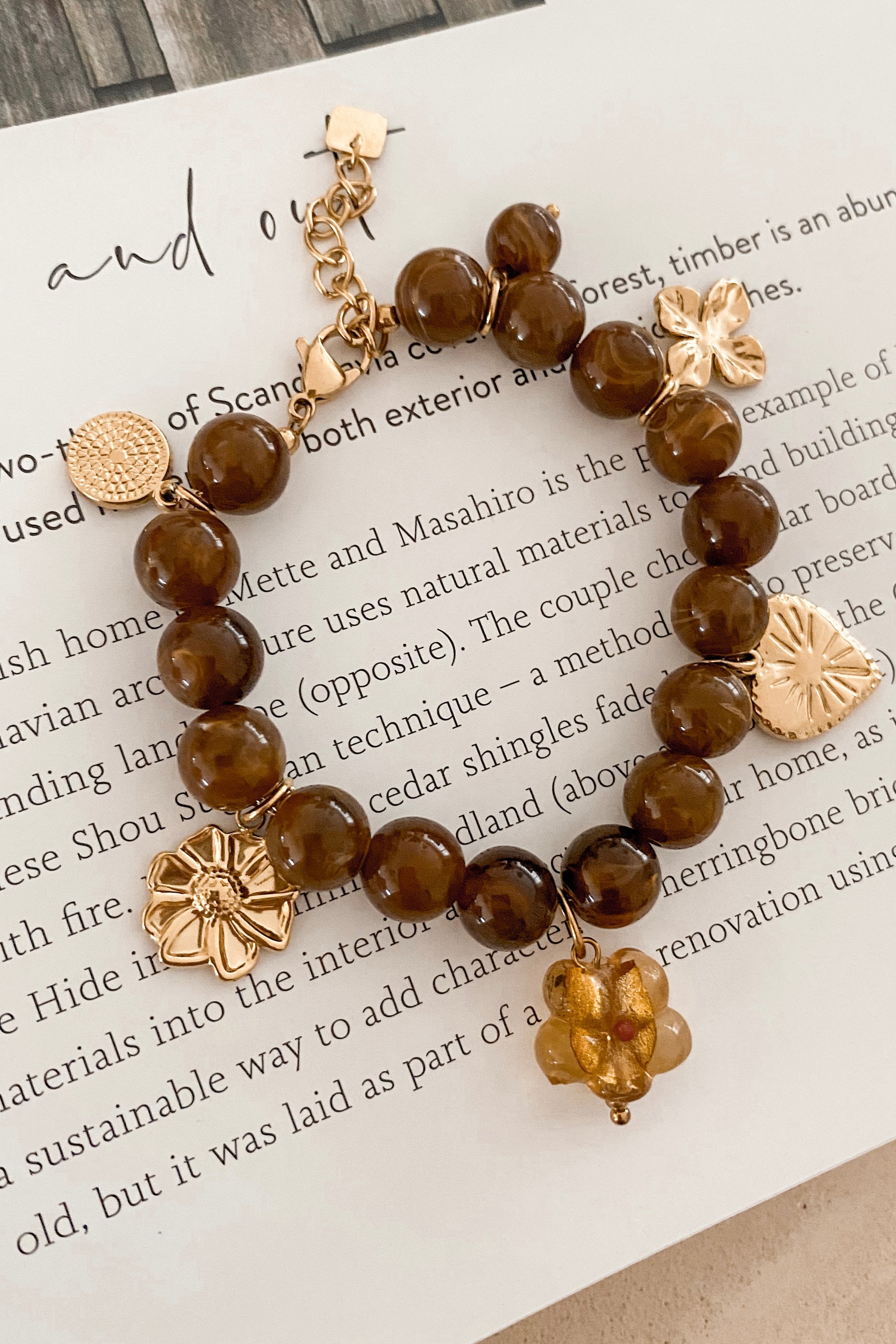 Un bracelet délicat en acier inoxydable, composé de jolies perles marron et de breloques dorées en forme de fleurs et de cœur. Une pièce pleine de douceur, parfaite pour accessoiriser vos looks au quotidien.