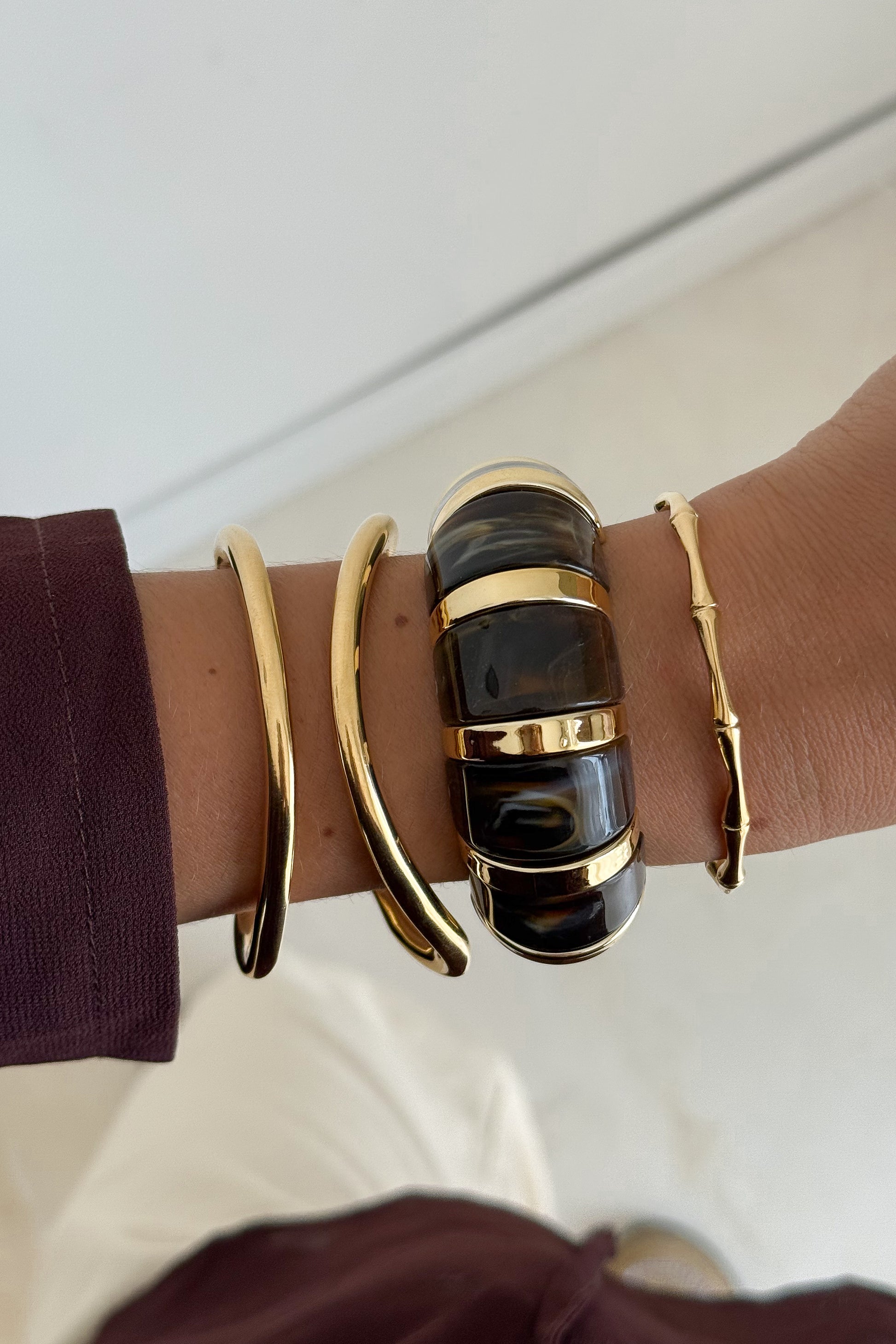Ce bracelet en résine associe harmonieusement le marron et le doré pour un rendu élégant et chaleureux. Sa largeur de 3 cm en fait une pièce affirmée, tandis que son système élastique assure un confort optimal et une adaptation facile à toutes les tailles de poignet. Idéal porté seul comme pièce forte ou en accumulation pour un look tendance.