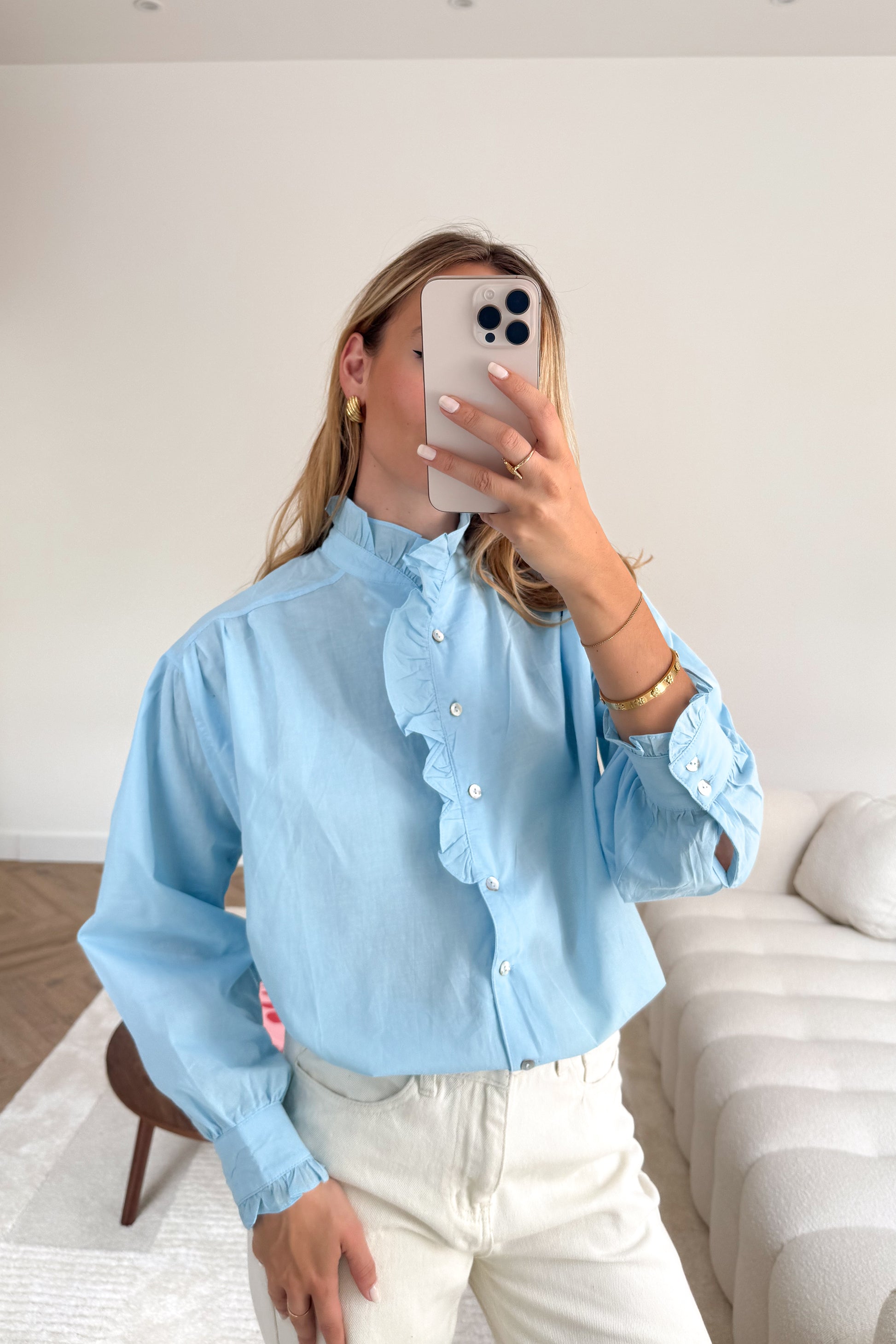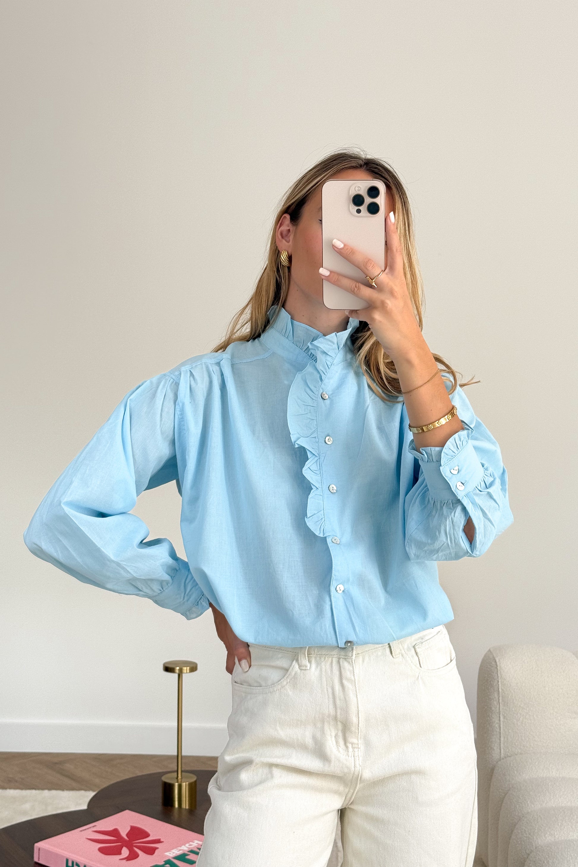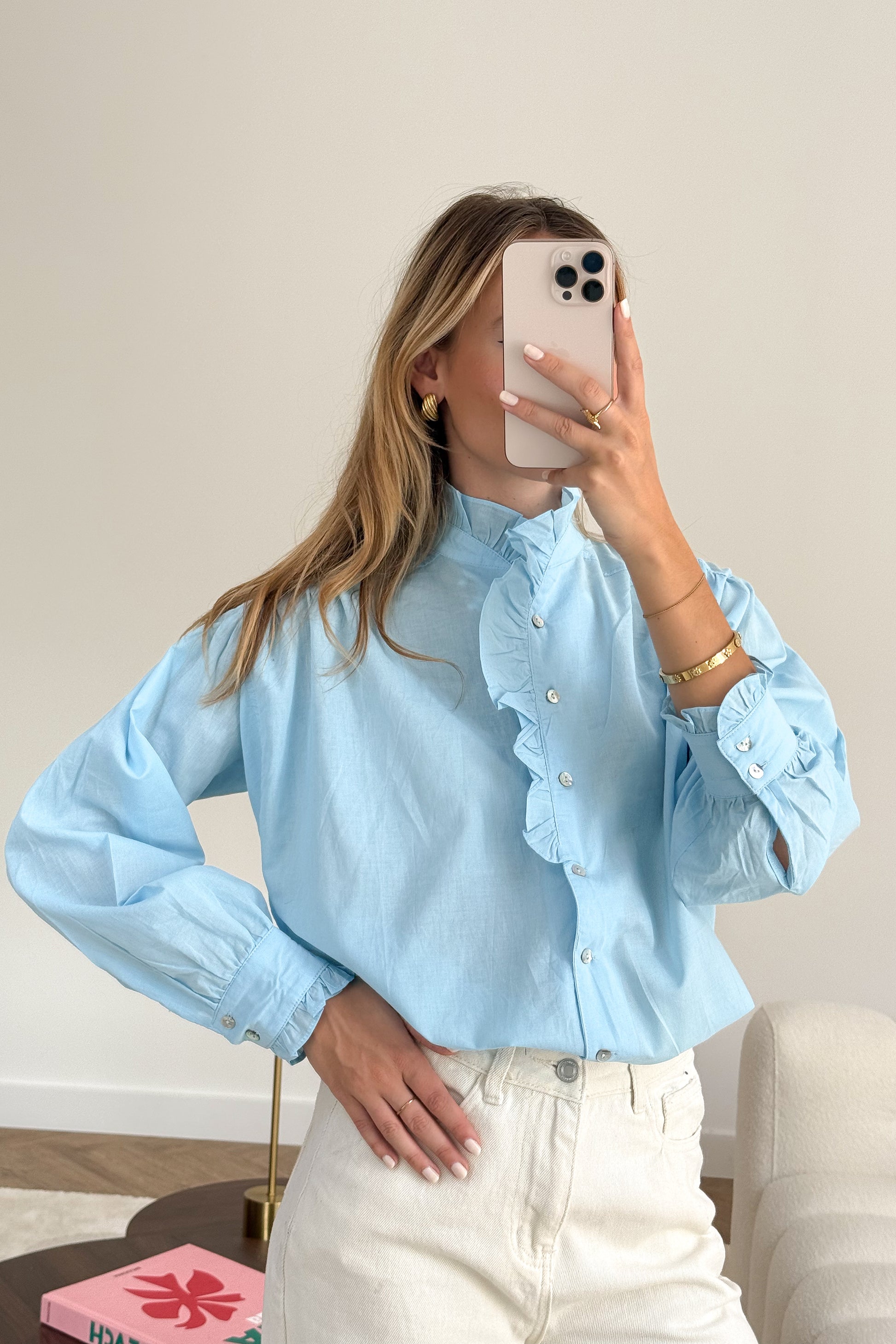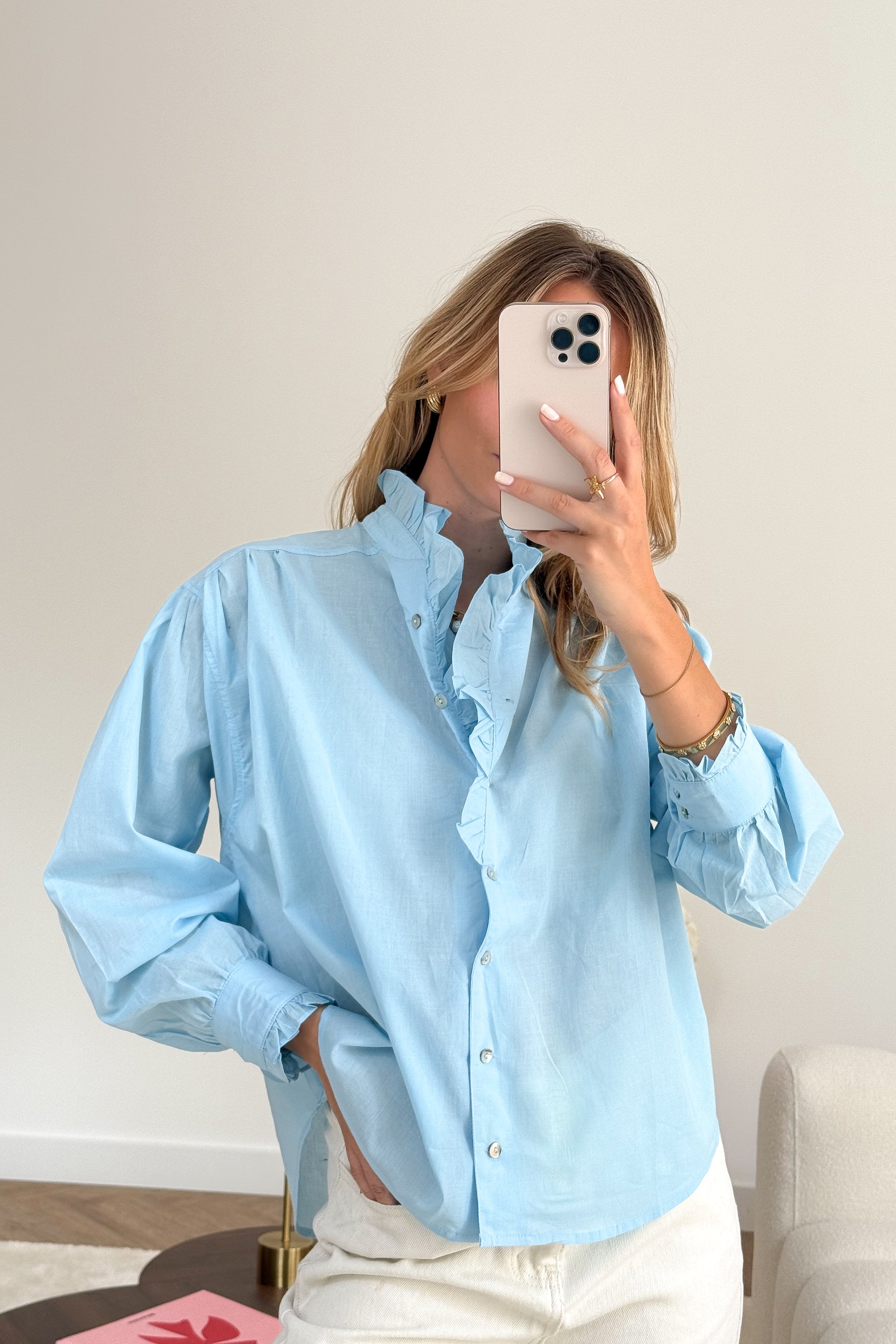 Chemisier fluide bleu ciel – Détails col & boutons nacrés