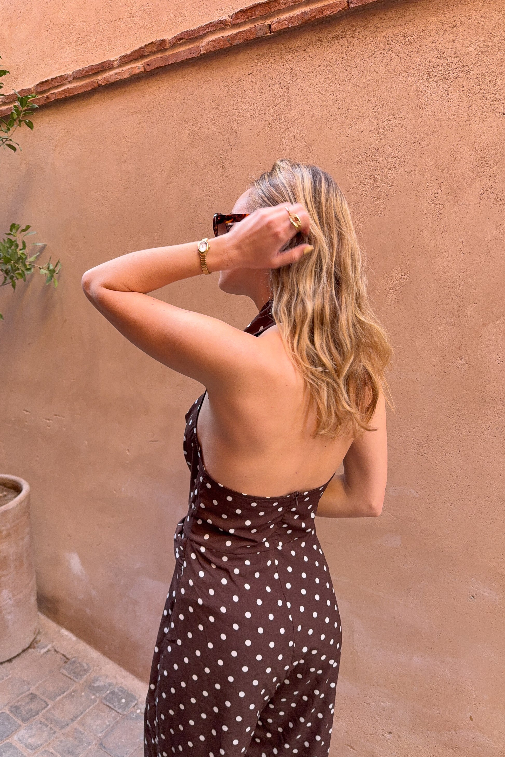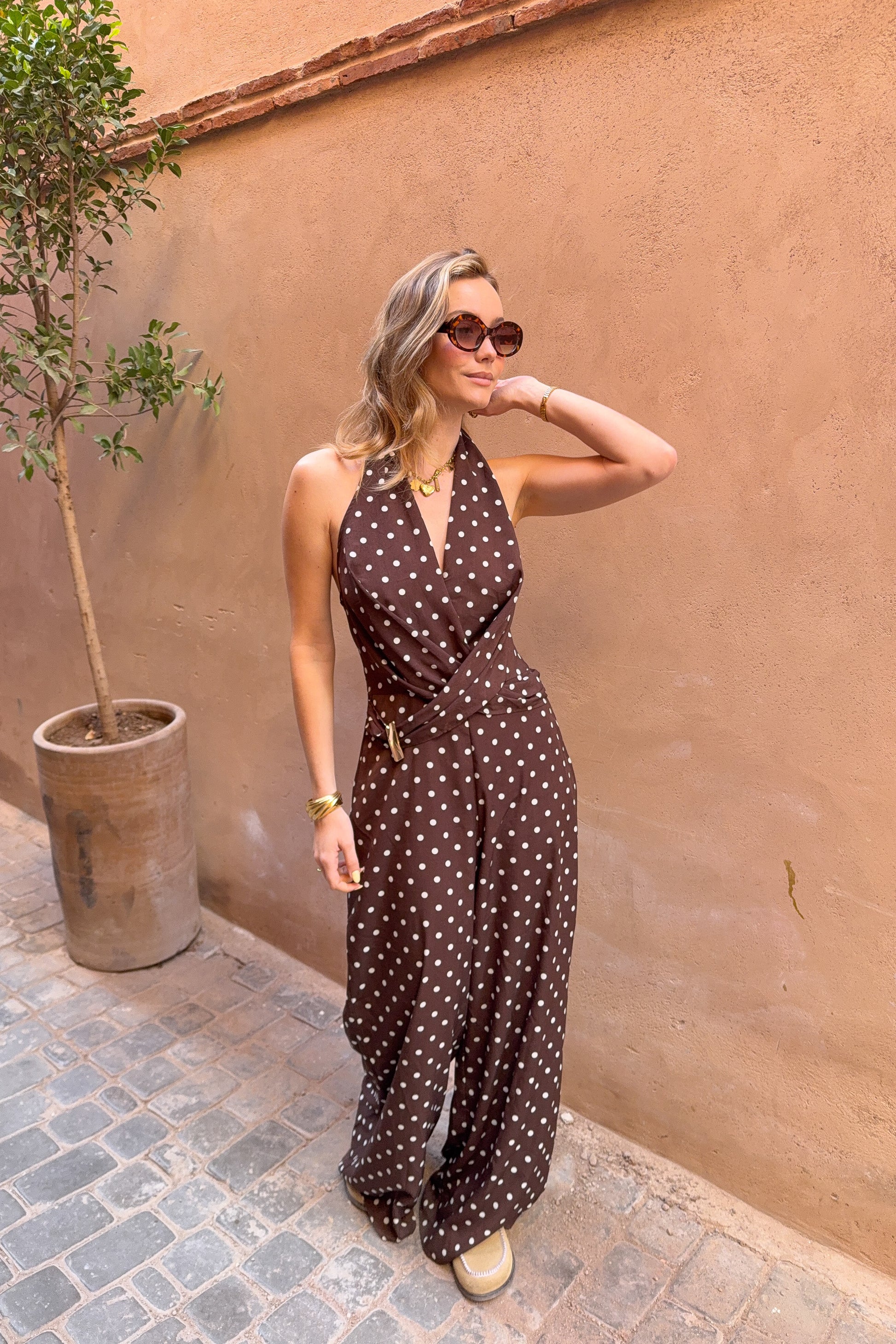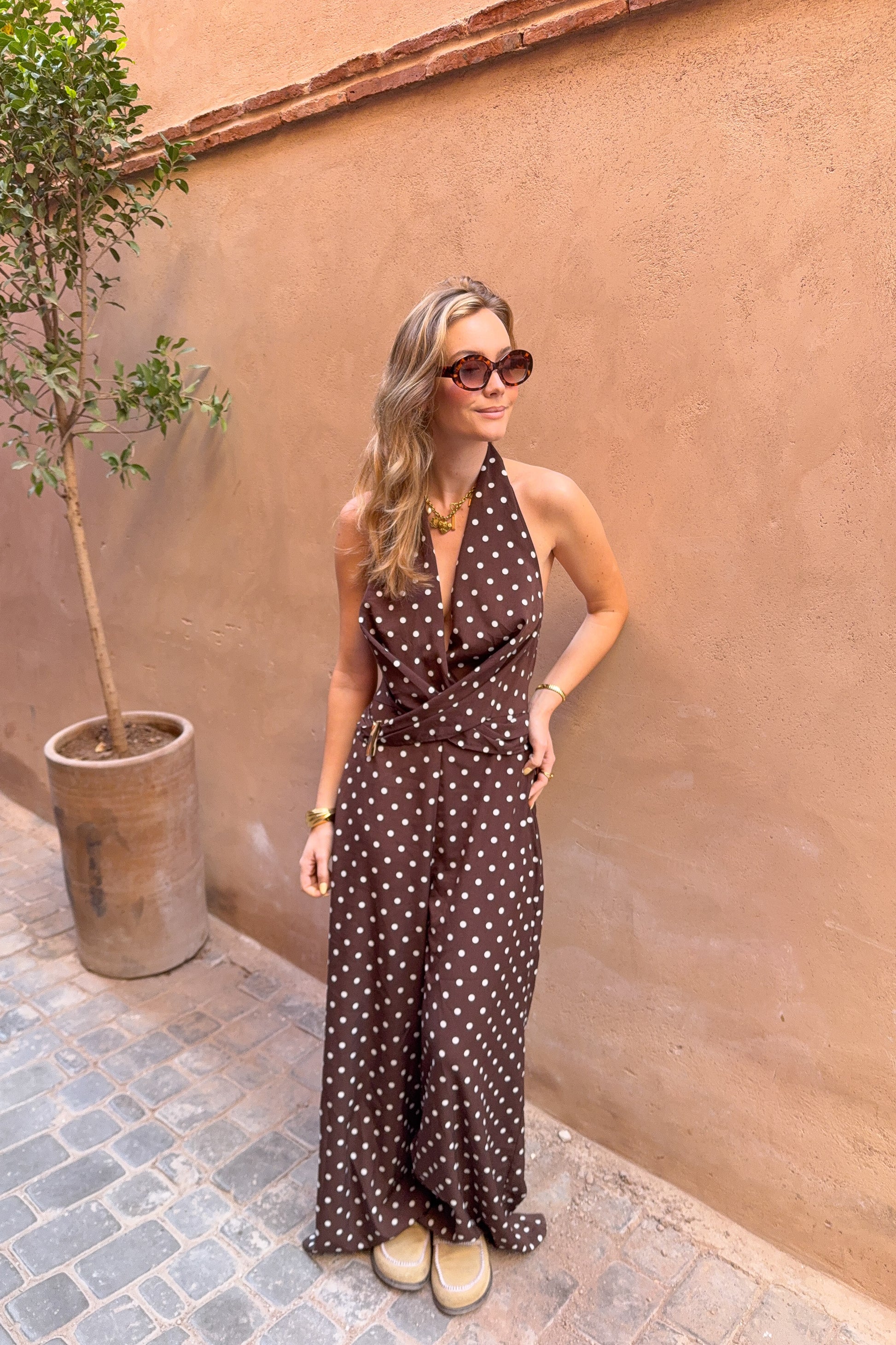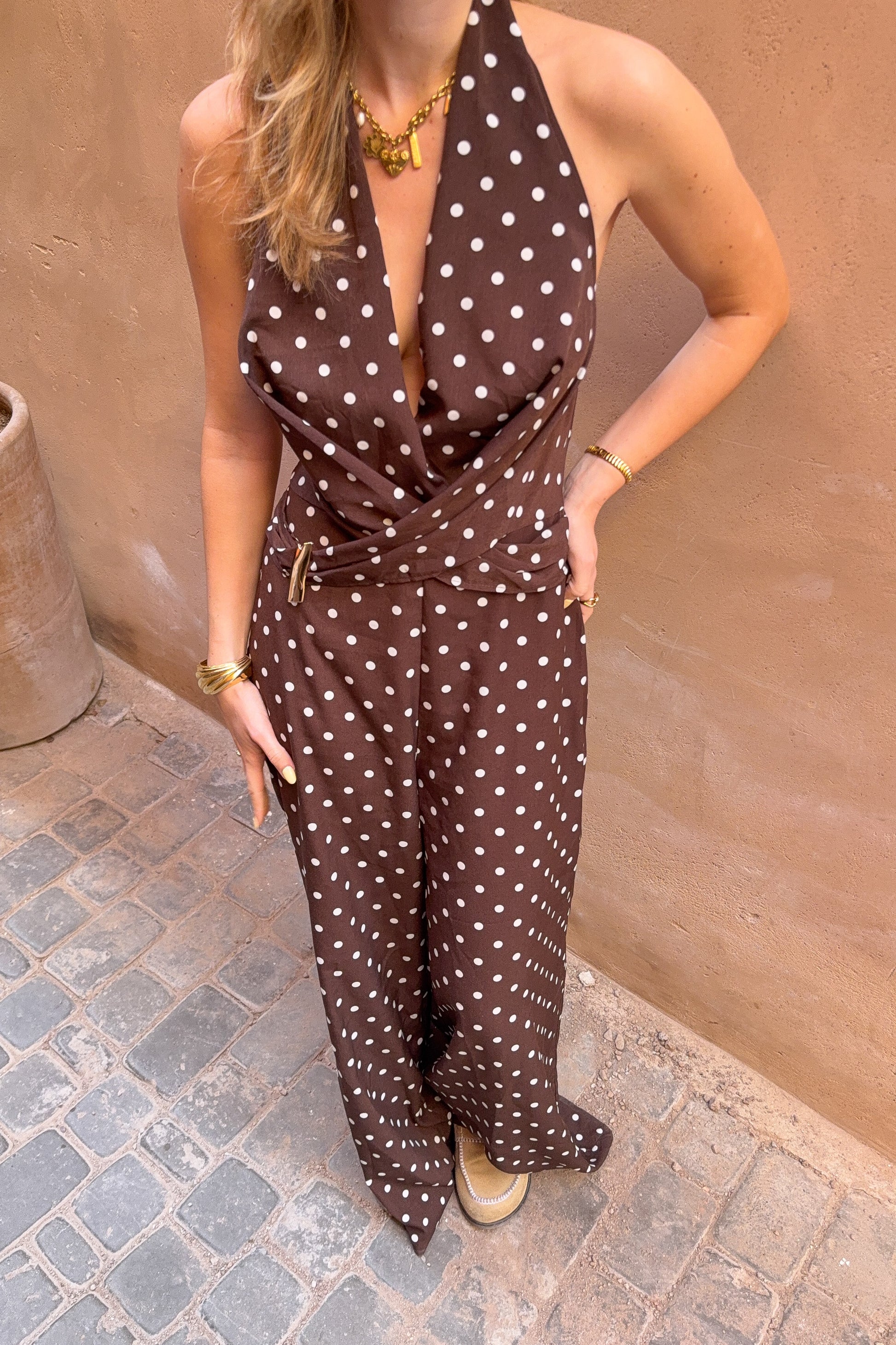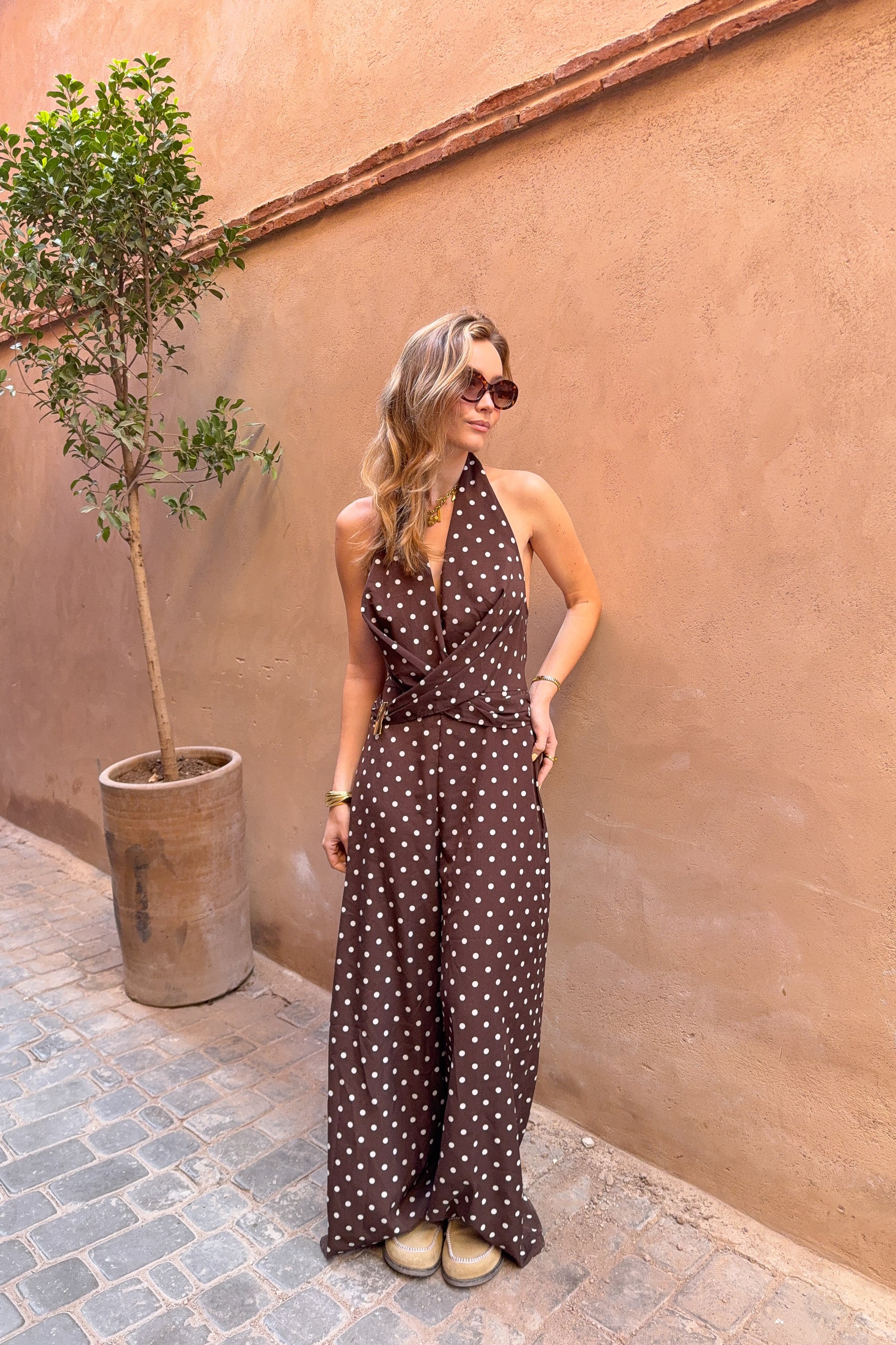 Une combi-pantalon élégante avec un col V et un joli dos nu qui sublime la silhouette. Une petite broche dorée au niveau de la taille.