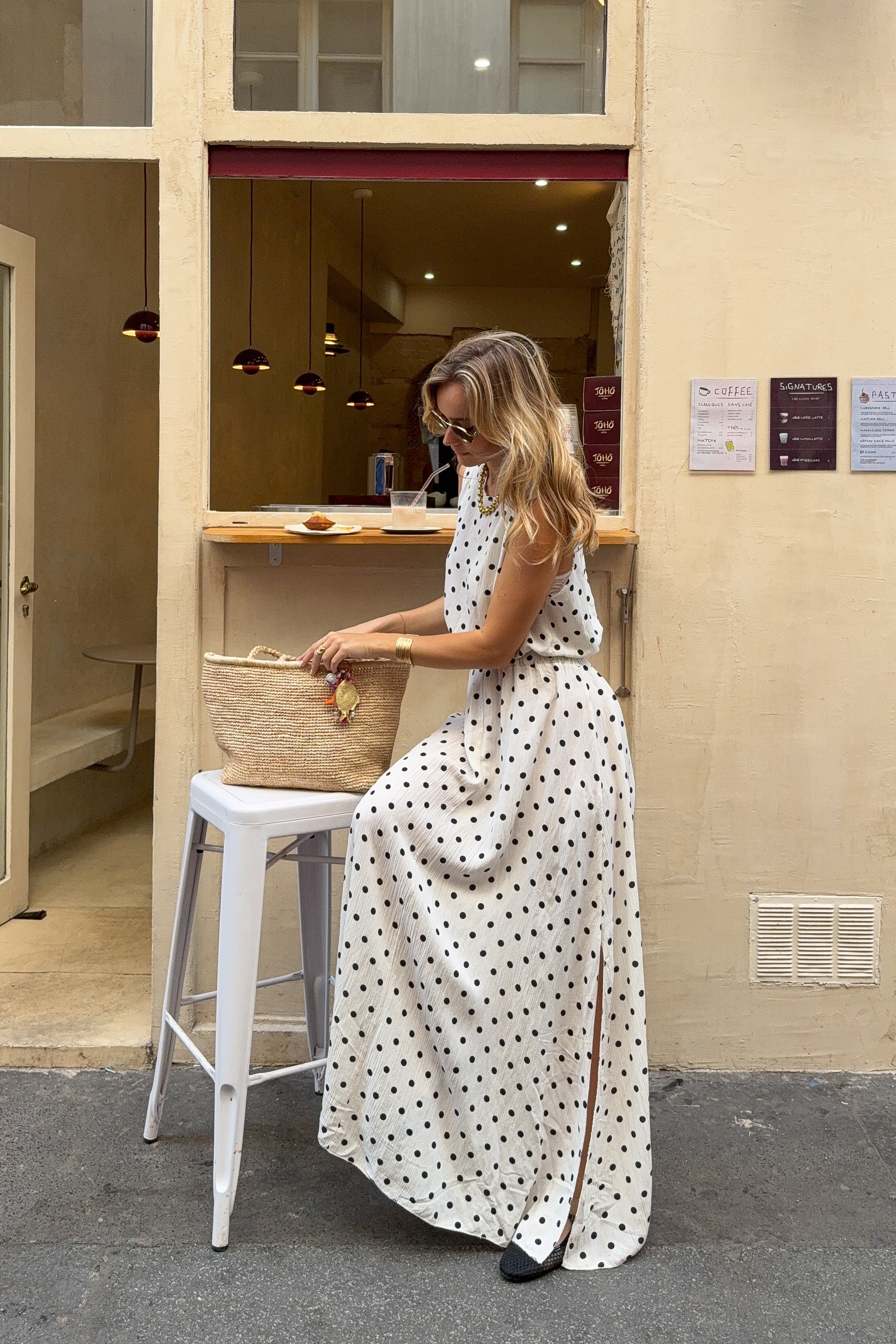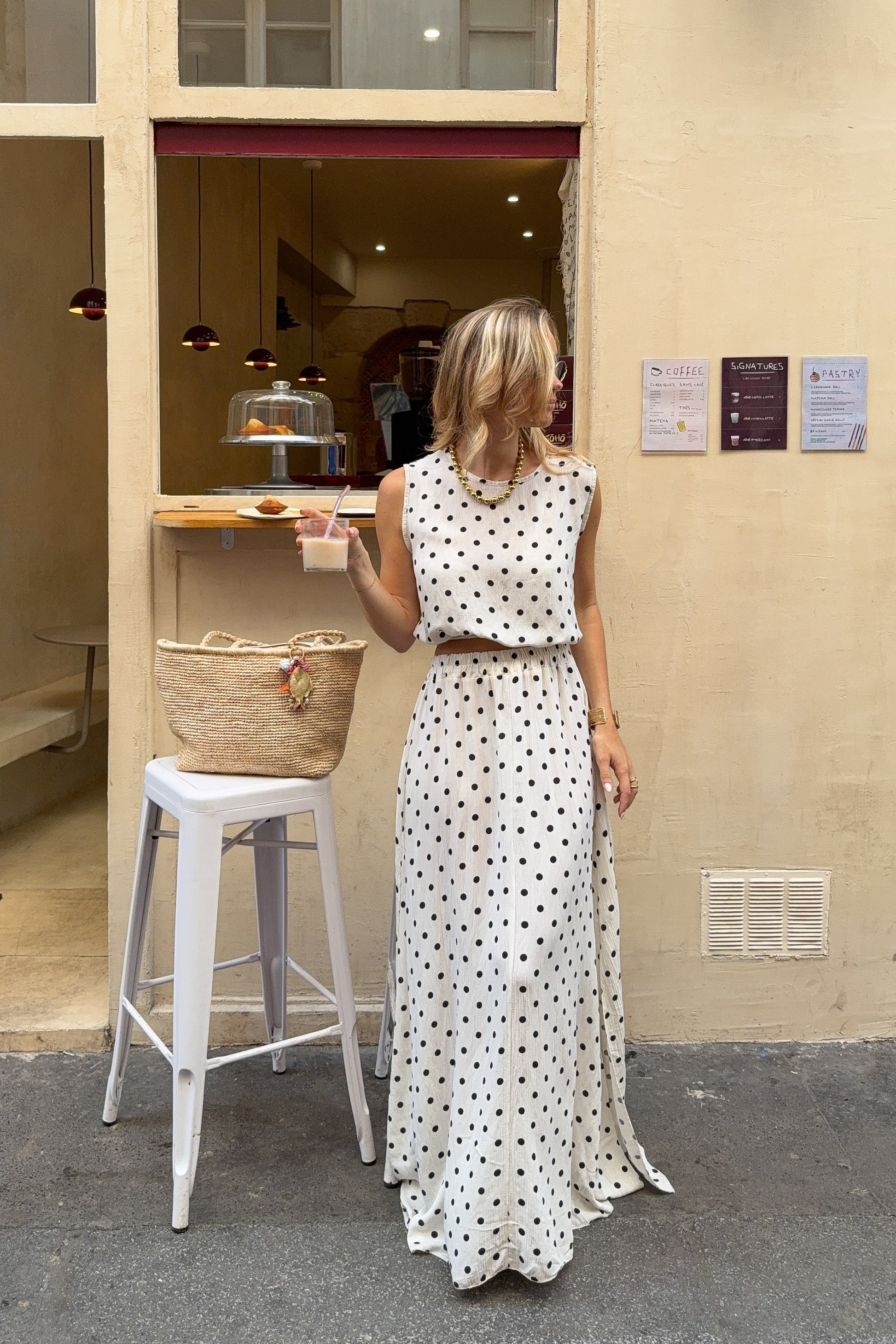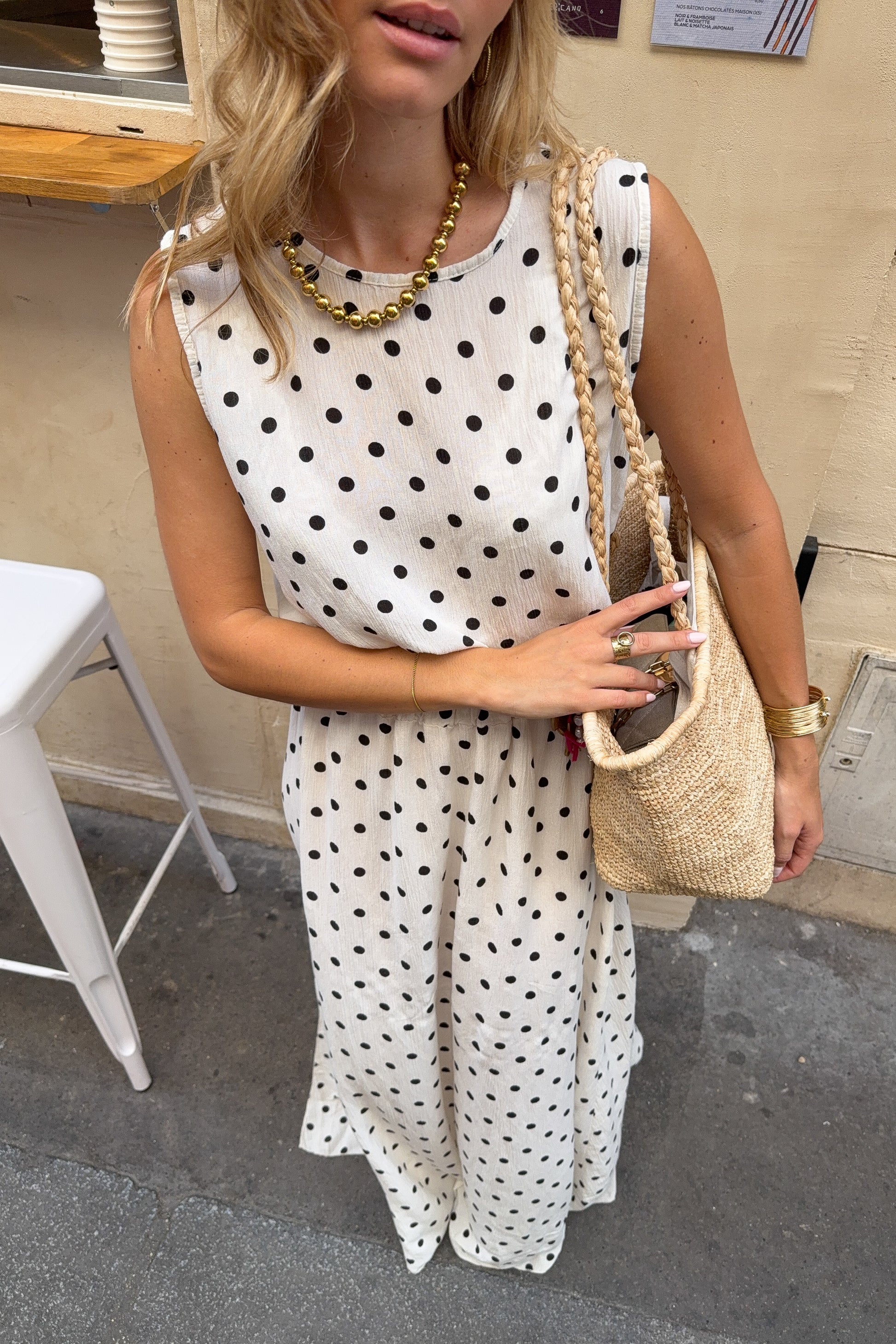 Ensemble deux pièces en beige à pois noirs, confectionné dans un tissu léger et légèrement texturé pour une texture subtile. Il se compose d’un top sans manches à encolure ronde et d’une jupe longue fluide avec fente sur le côté. Une silhouette épurée et confortable, idéale pour les journées chaudes.