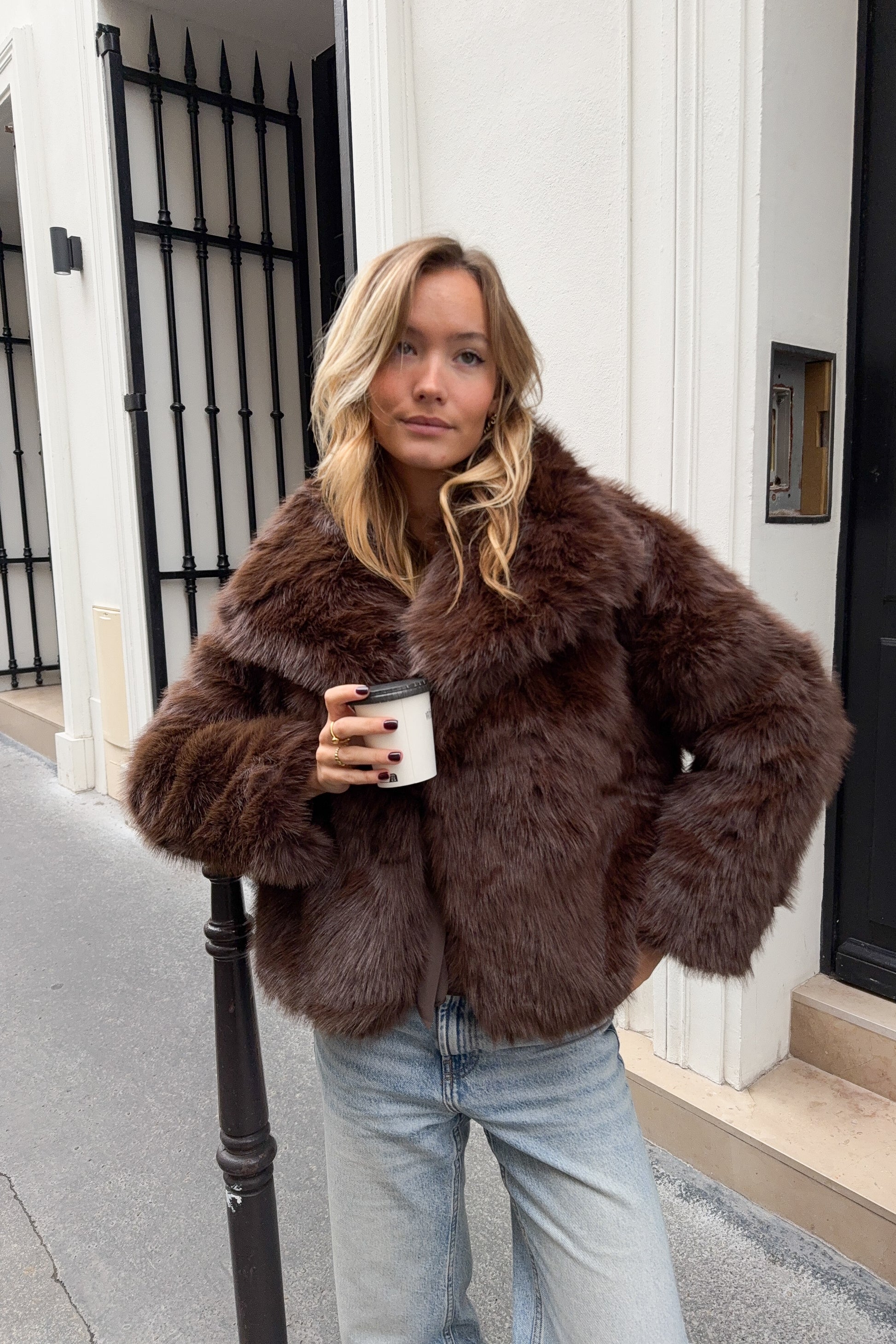 Veste en fausse fourrure dans les tons marron, à la fois chic et confortable. Sa doublure apporte un confort supplémentaire, tandis que sa coupe en taille unique en fait une pièce facile à porter et à superposer. Une veste de sublime qualité, idéale pour un look élégant et chaleureux.