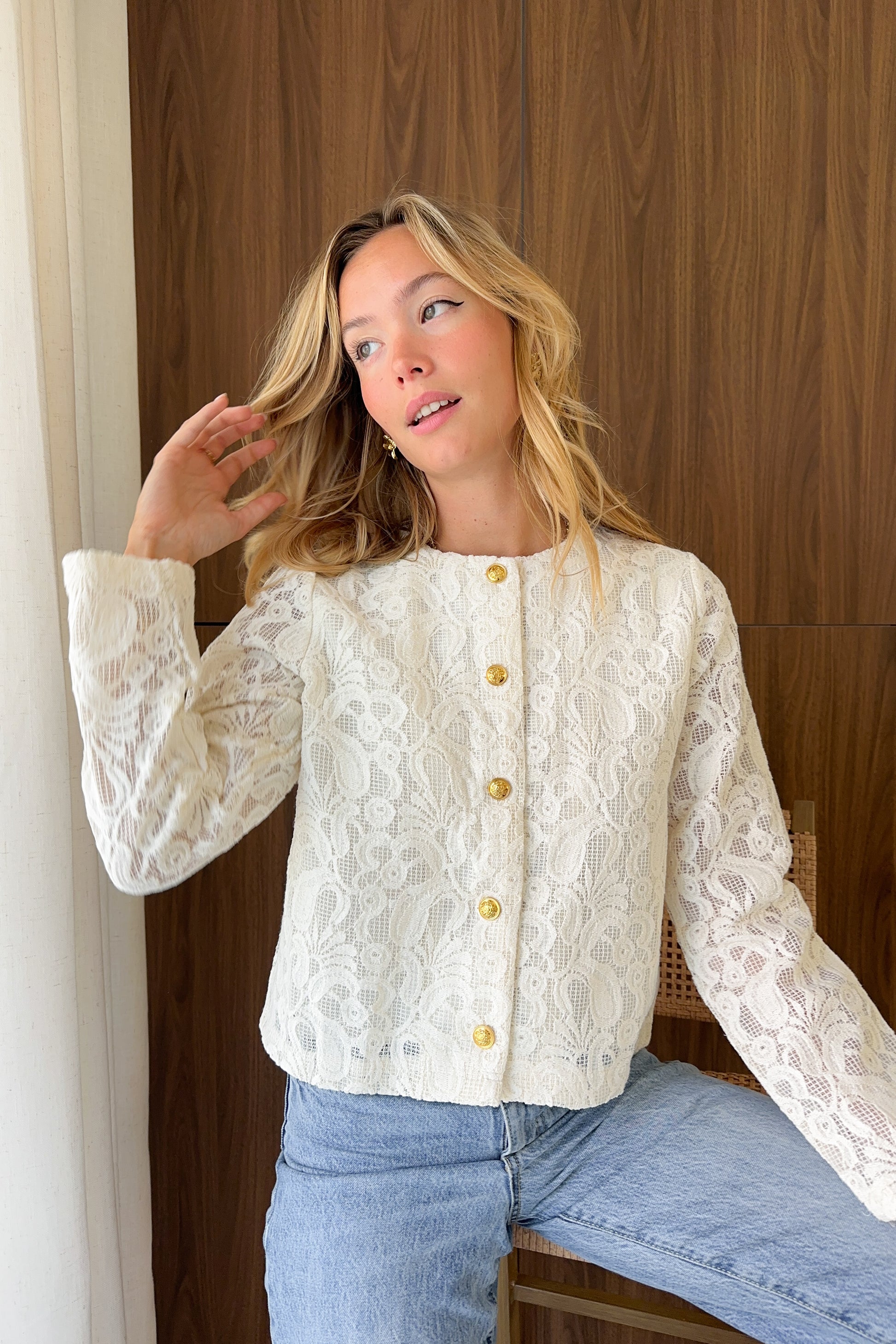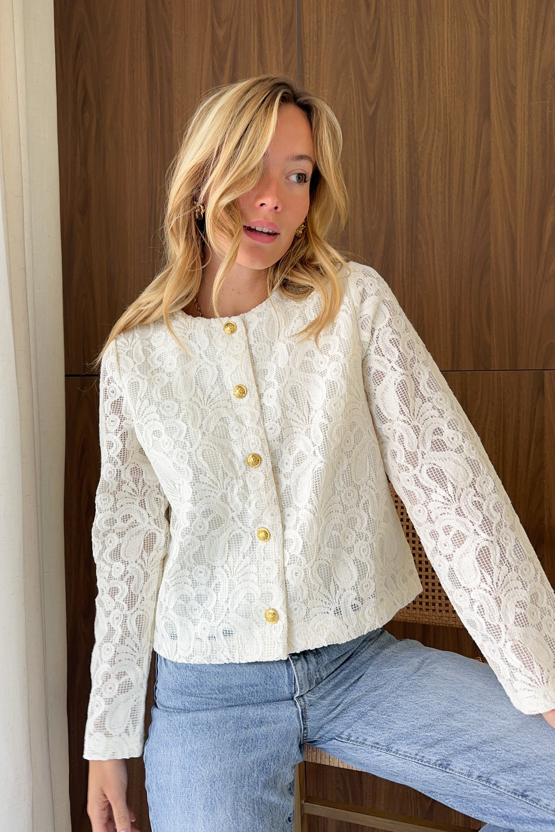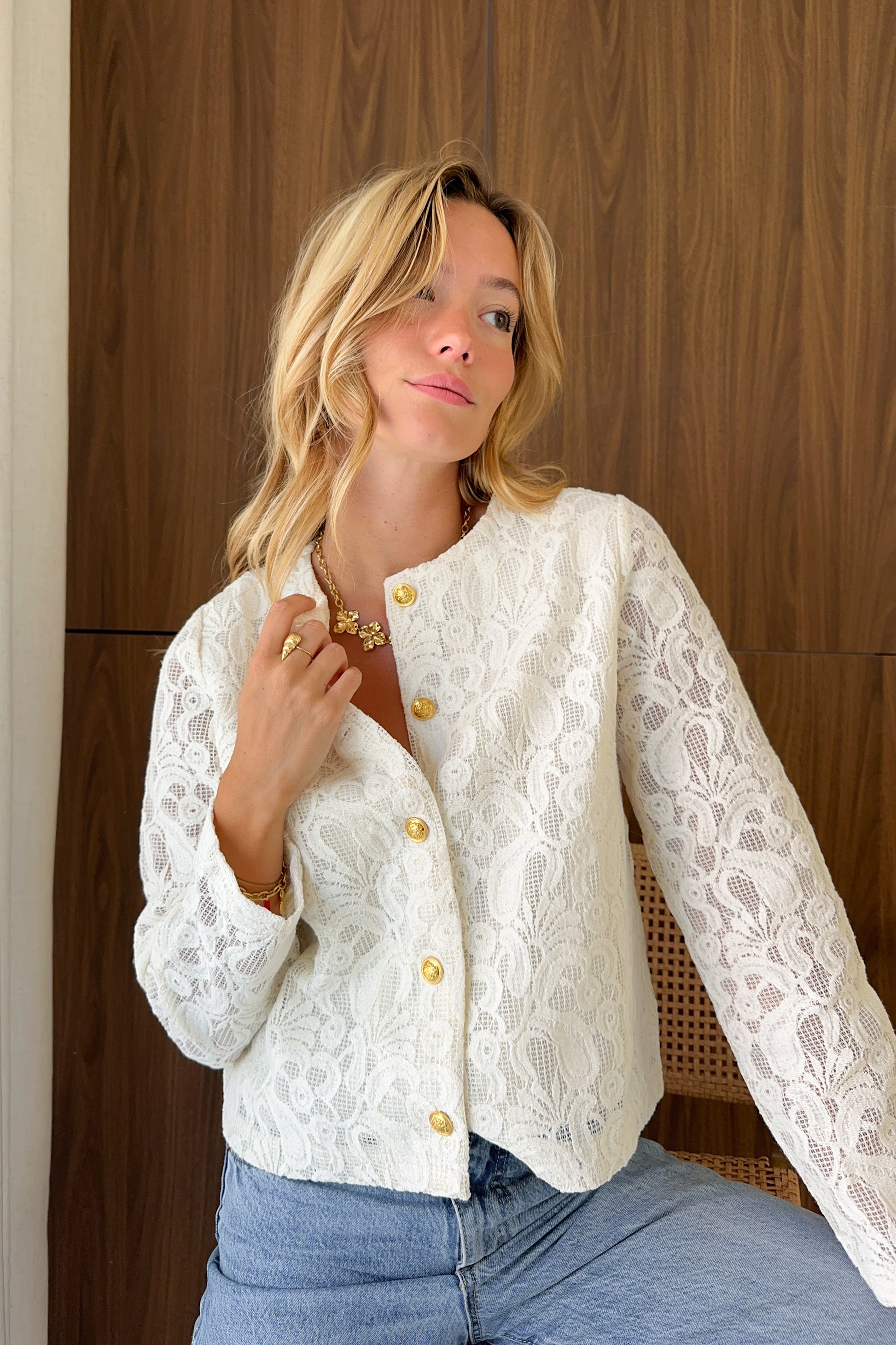 Ce gilet écru séduit par son délicat motif façon dentelle et sa belle tenue, qui structure la silhouette avec élégance. Confectionné dans un mélange doux de coton (60%) et nylon (40%), il offre un toucher agréable et un tombé soigné.