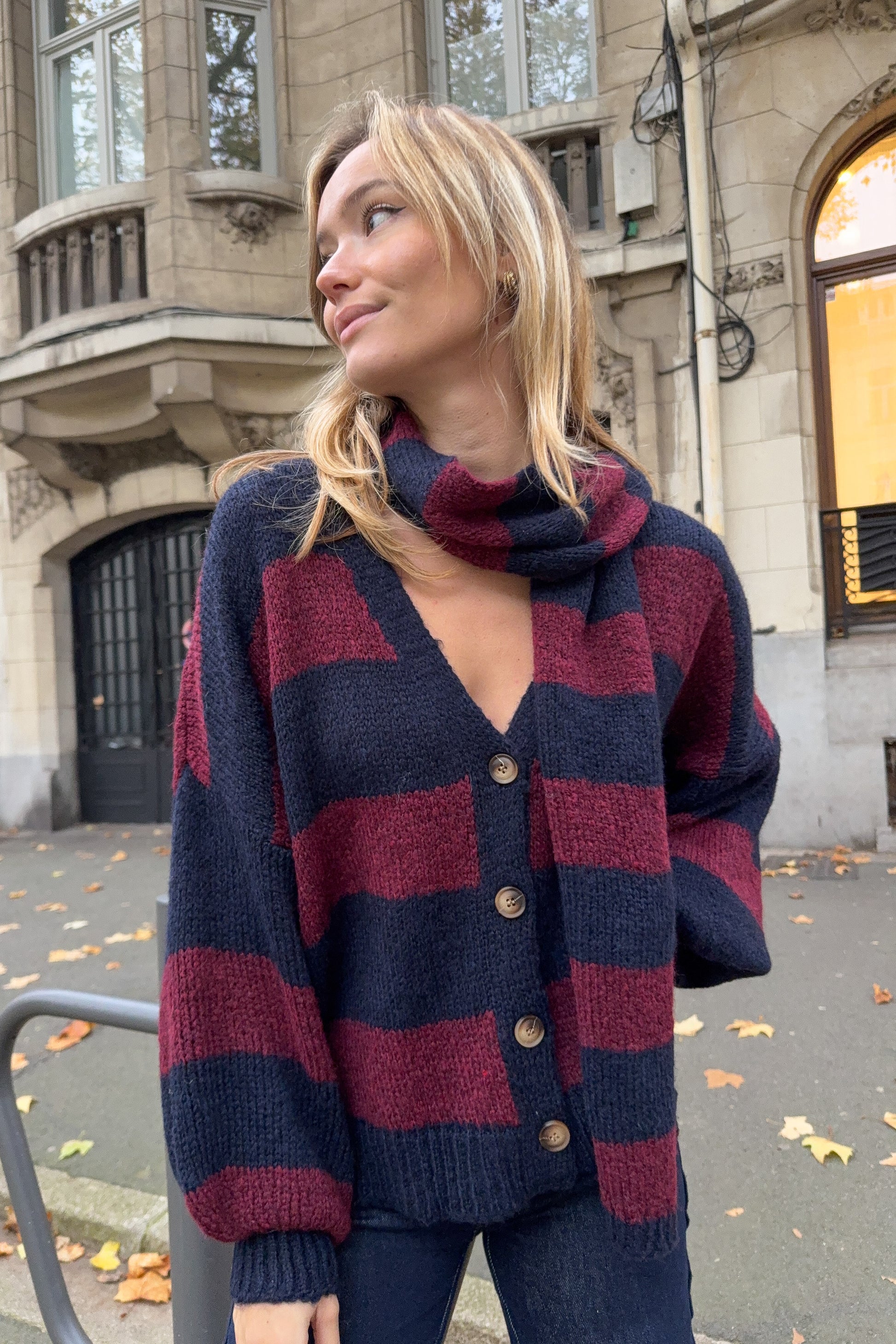 Un gilet au style affirmé, alliant douceur et confort. Ses rayures marine et bordeaux apportent une touche de caractère, tandis que sa coupe fluide et son écharpe assortie complètent le look avec élégance.