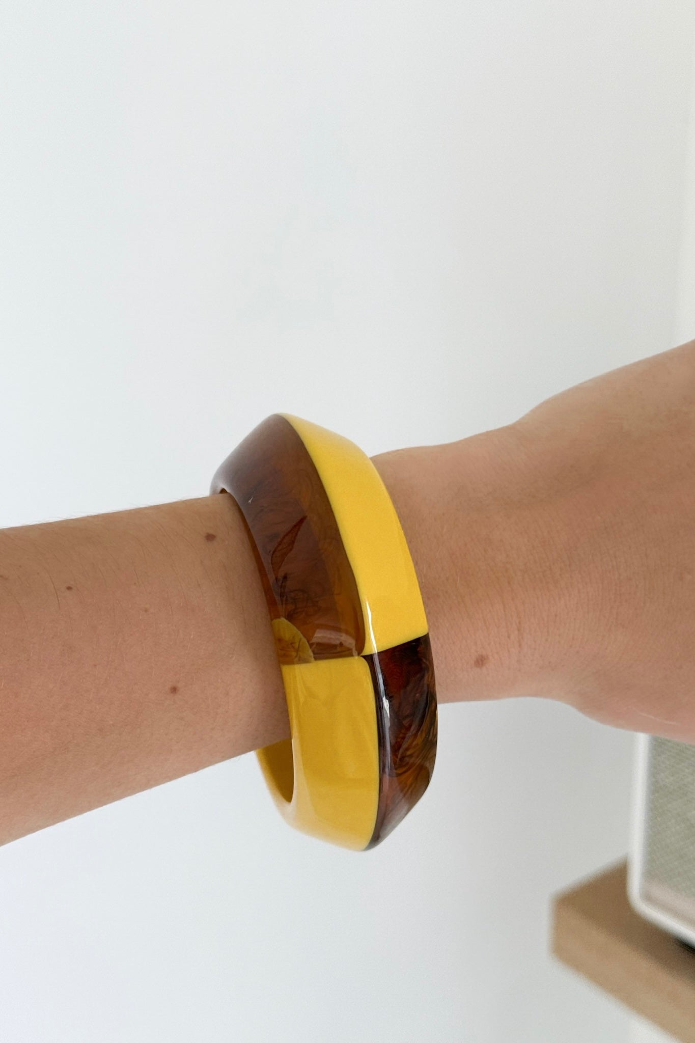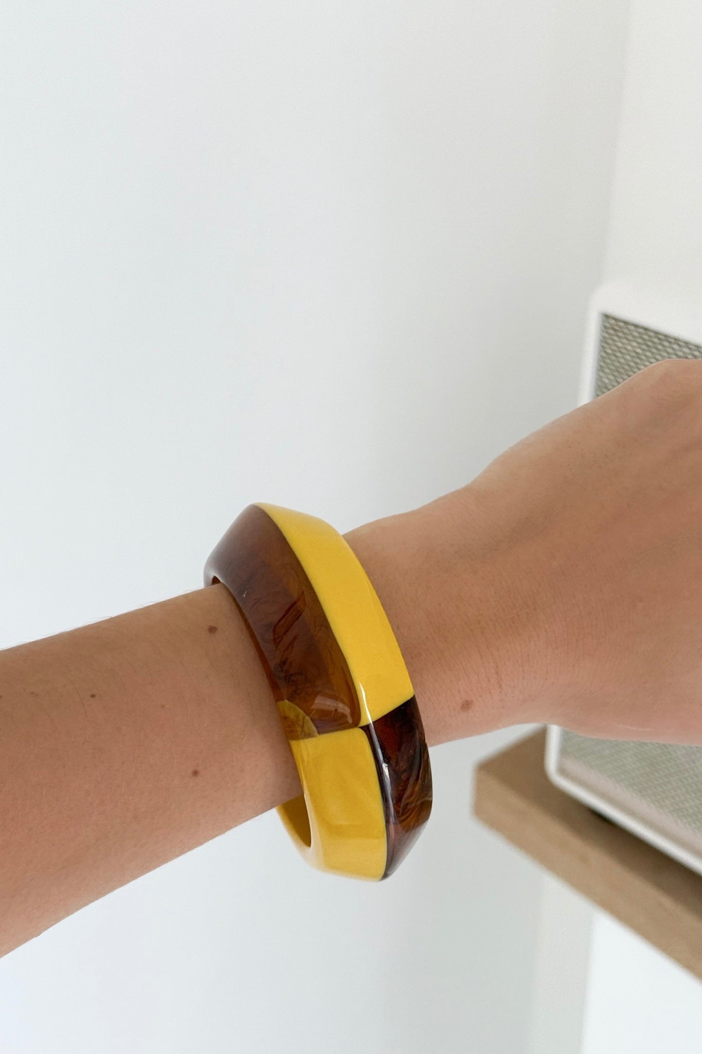 Jonc aux nuances moutarde et marron, travaillé dans un jeu de couleurs chaudes et élégantes. Son mélange de teintes automnales en fait un accessoire unique, facile à associer avec vos tenues du quotidien comme avec un look plus habillé. Léger et confortable à porter, il apportera une note raffinée et originale à votre style.