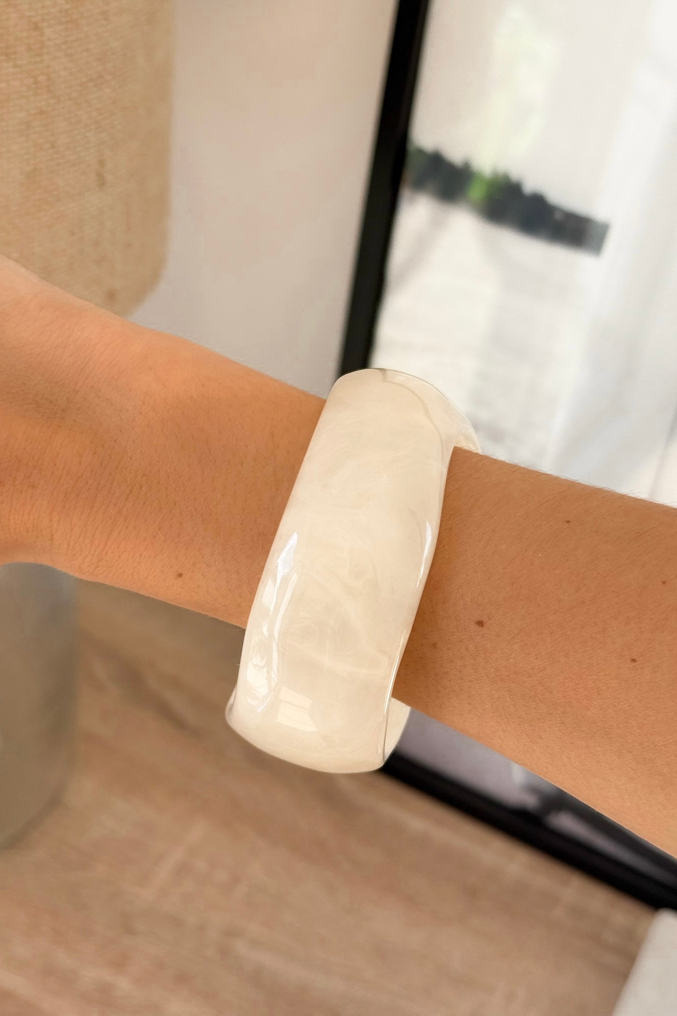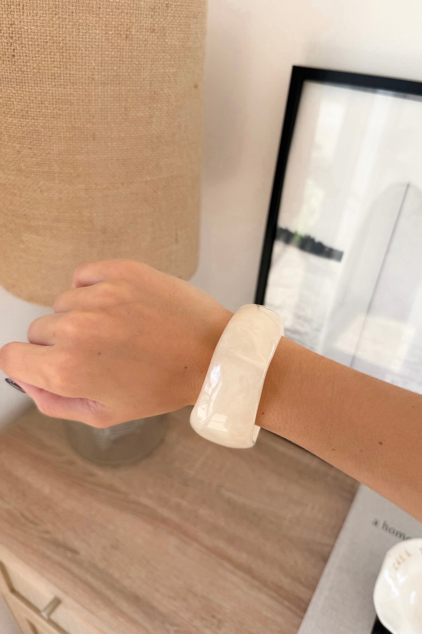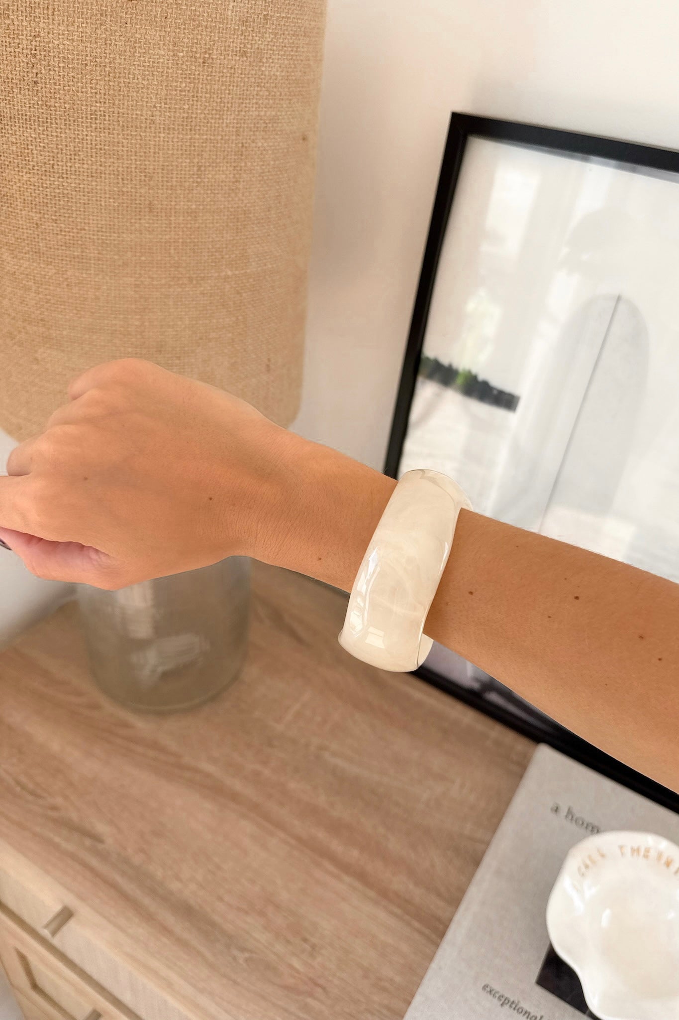 Un jonc nacré dont la largeur varie pour atteindre un maximum de 3,5 cm, ce qui en fait une pièce unique et élégante.