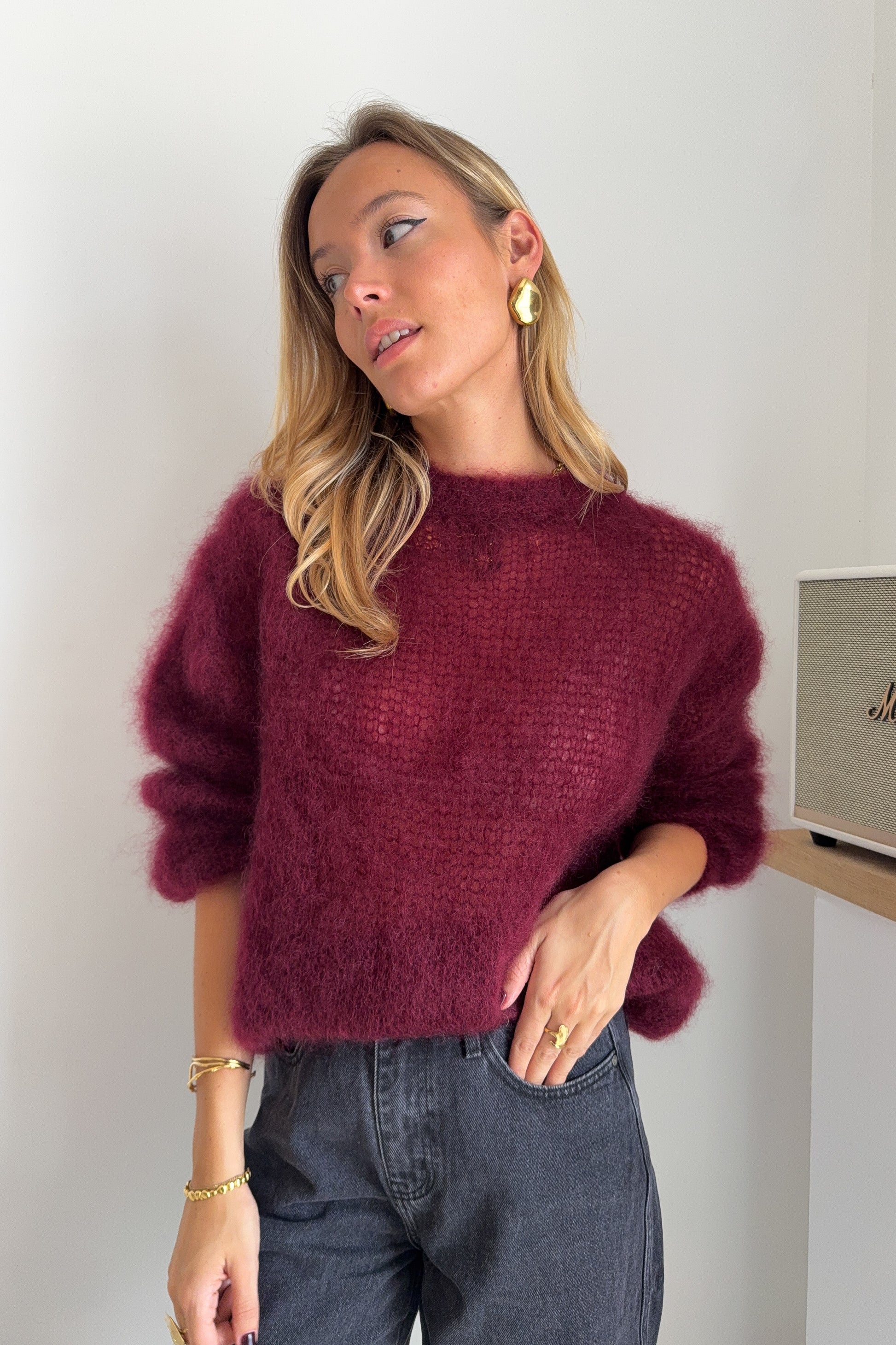 Maille fluffy bordeaux confectionnée en Italie, ultra douce et confortable. Sa texture légère et moelleuse en fait une pièce élégante et agréable à porter au quotidien.