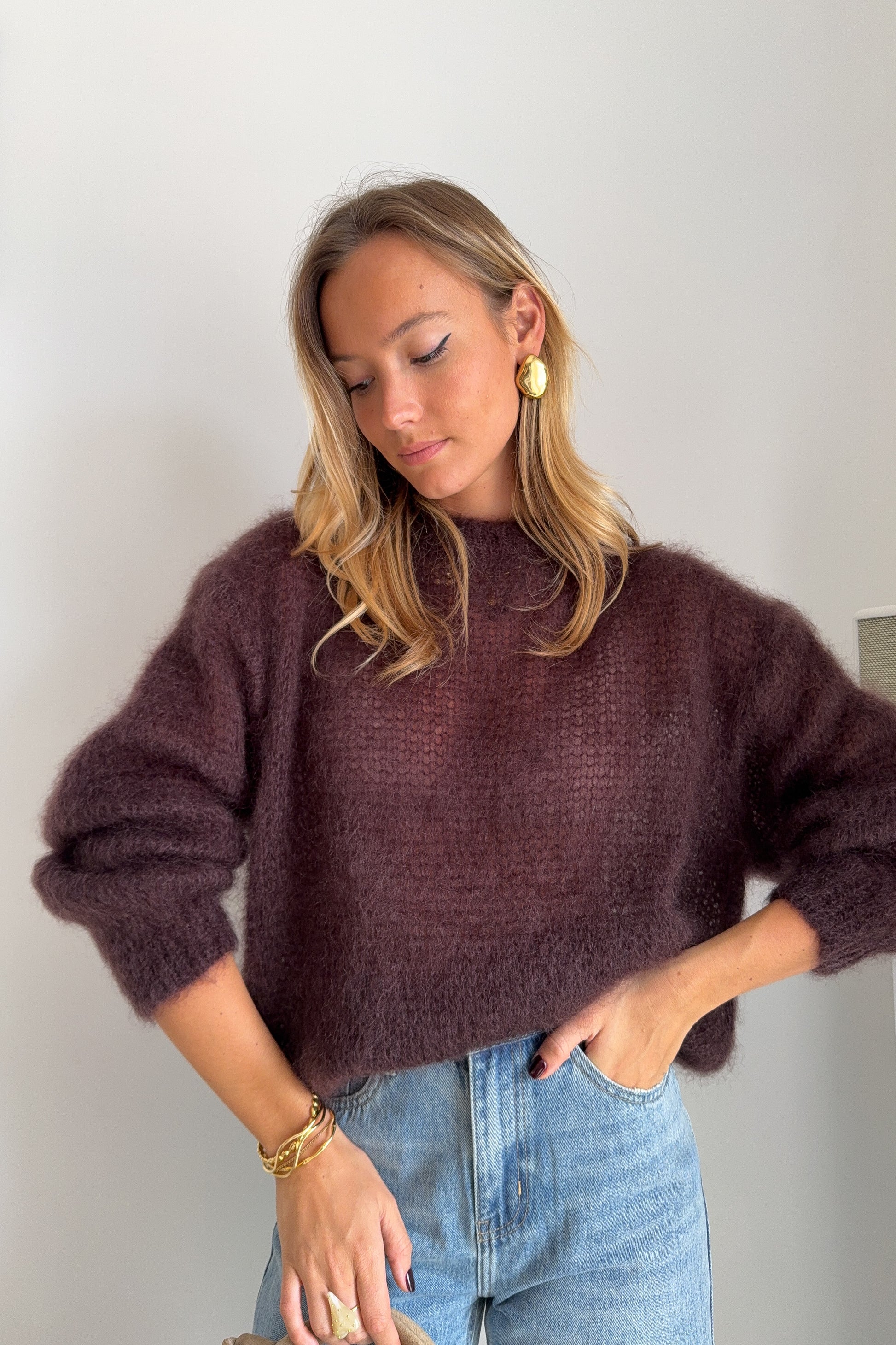 Maille fluffy chocolat confectionnée en Italie, ultra douce et confortable. Sa texture légère et moelleuse en fait une pièce élégante et agréable à porter au quotidien.