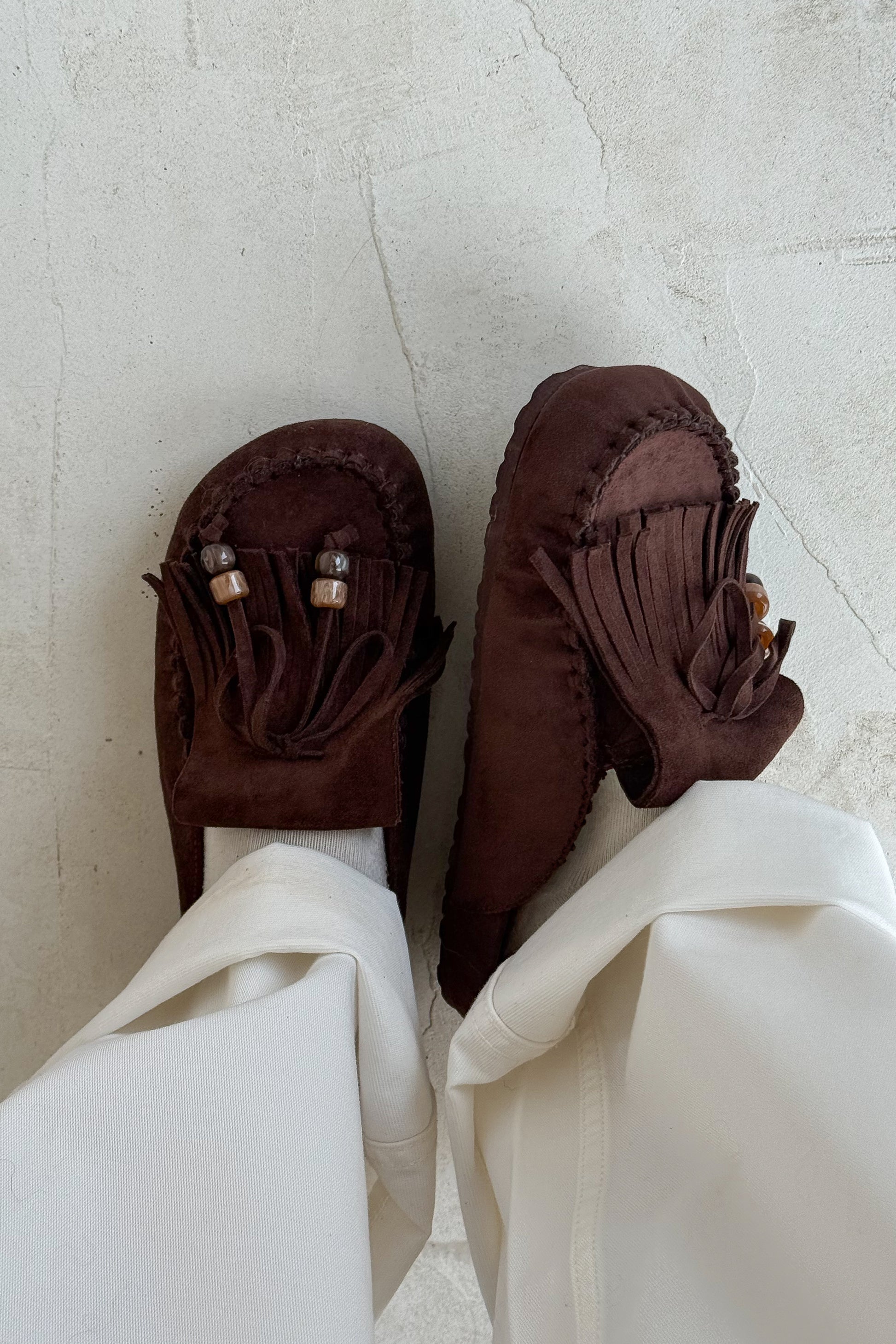 Mules marron ouvertes à franges et petites perles
