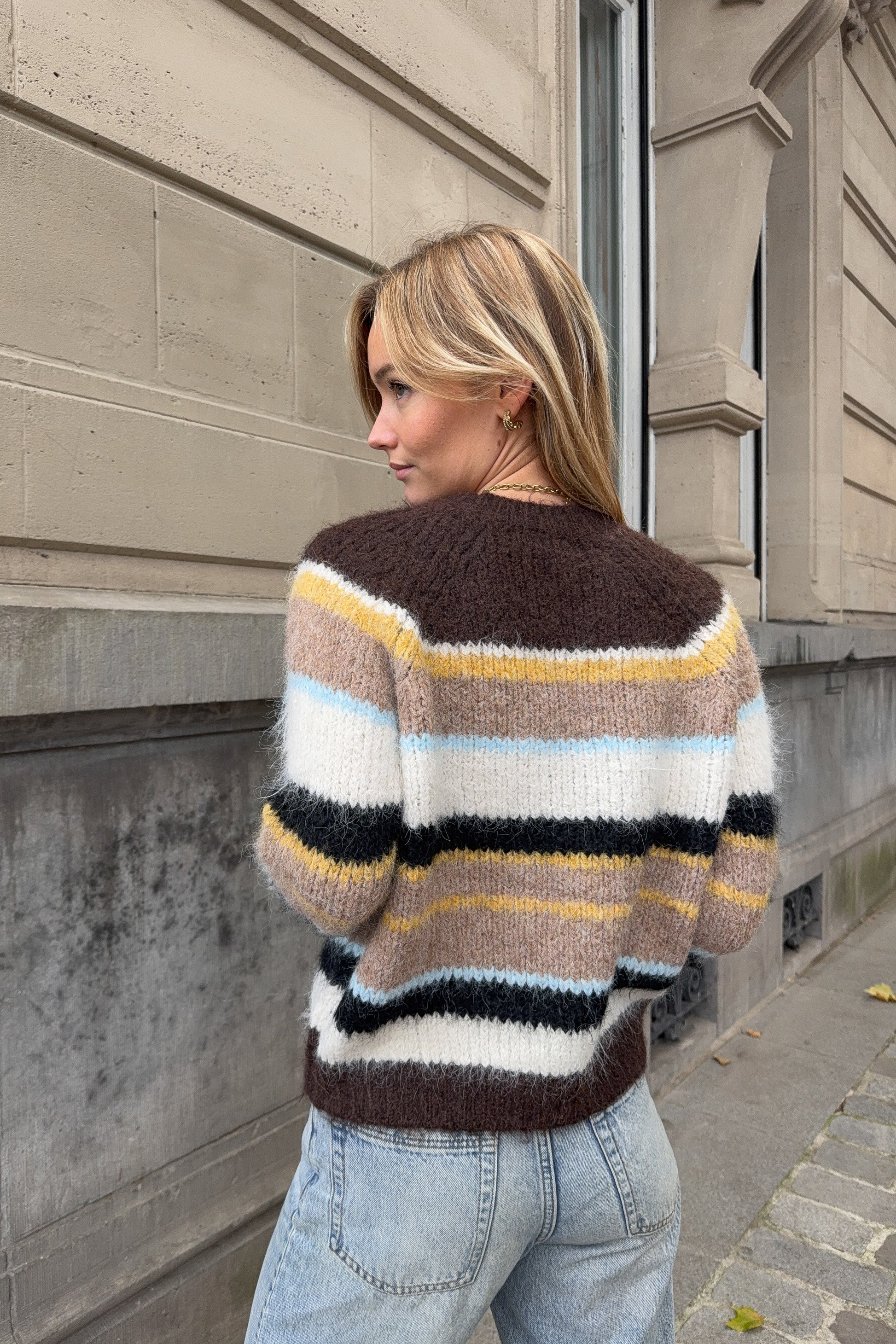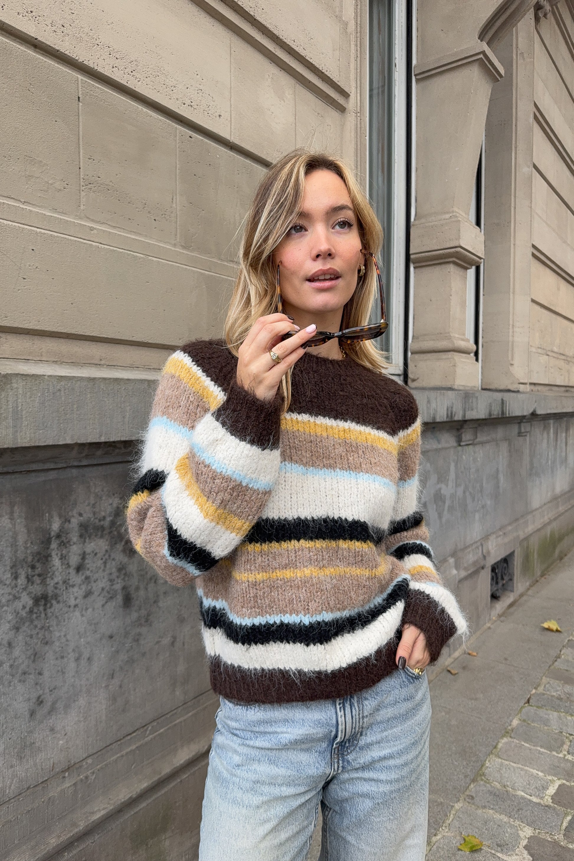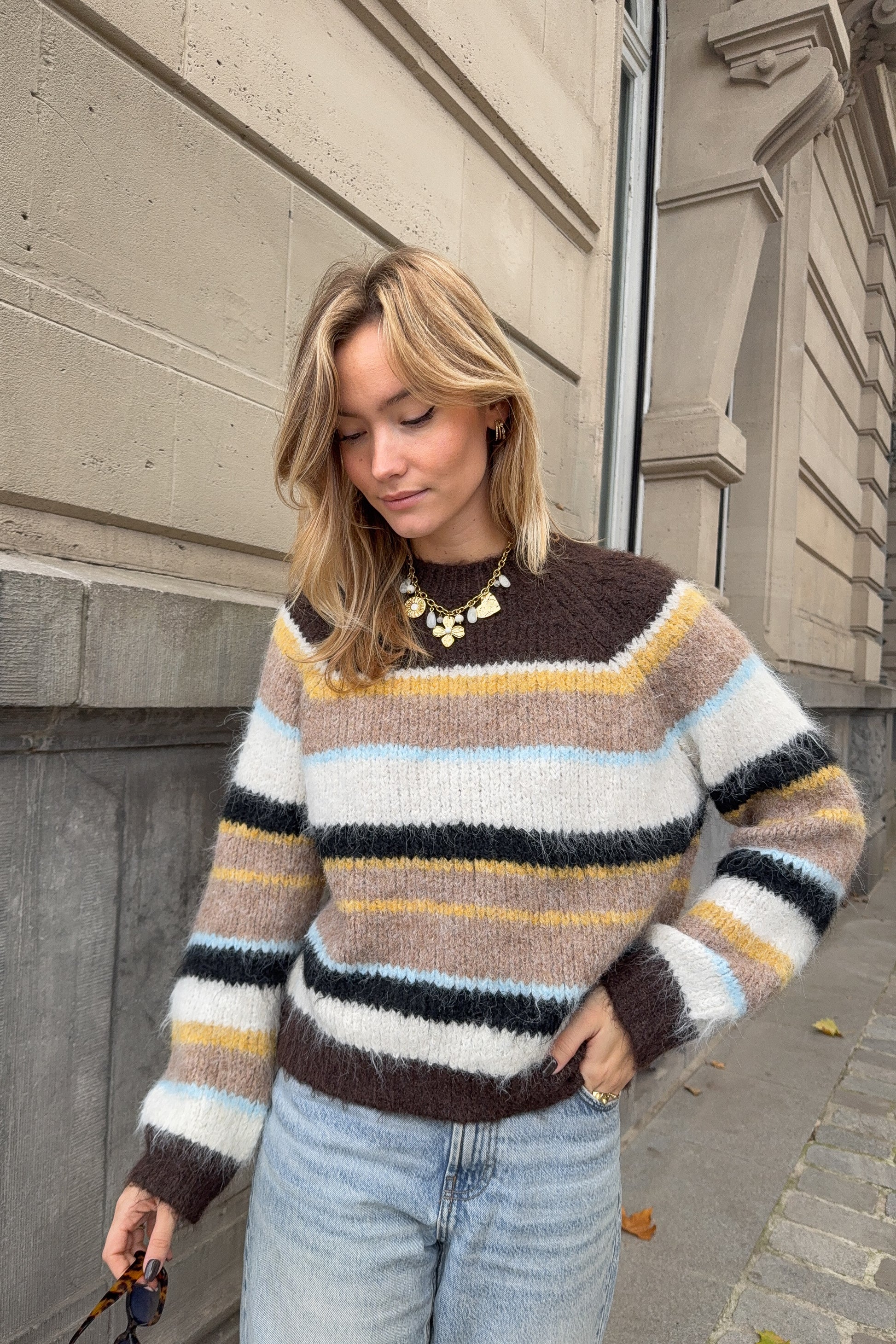 Un pull confortable et stylé, aux couleurs chaleureuses mêlant marron, écru, noir, bleu et moutarde. Sa maille douce et son col rond en font une pièce facile à porter au quotidien.