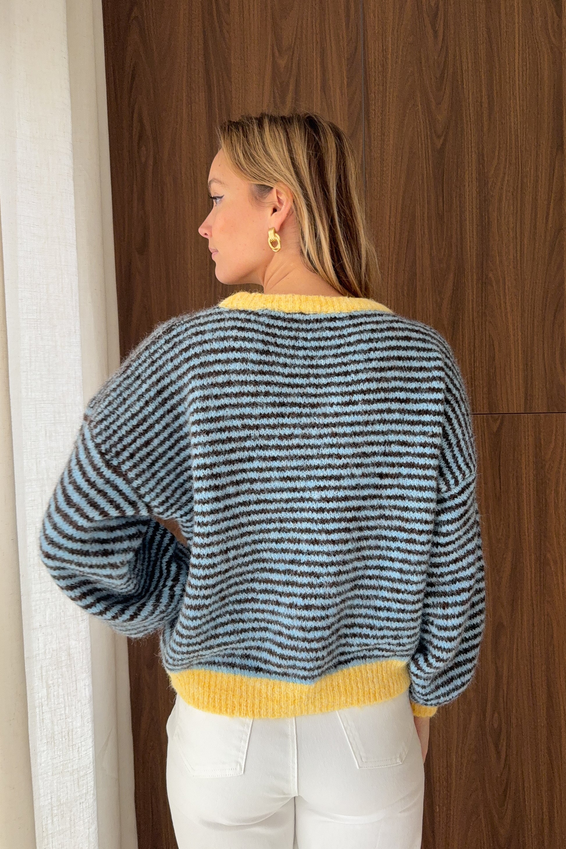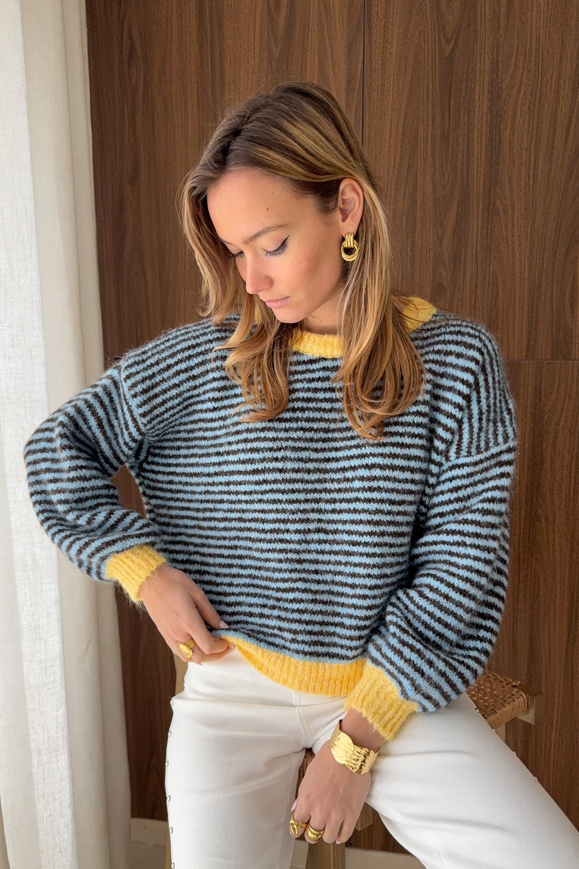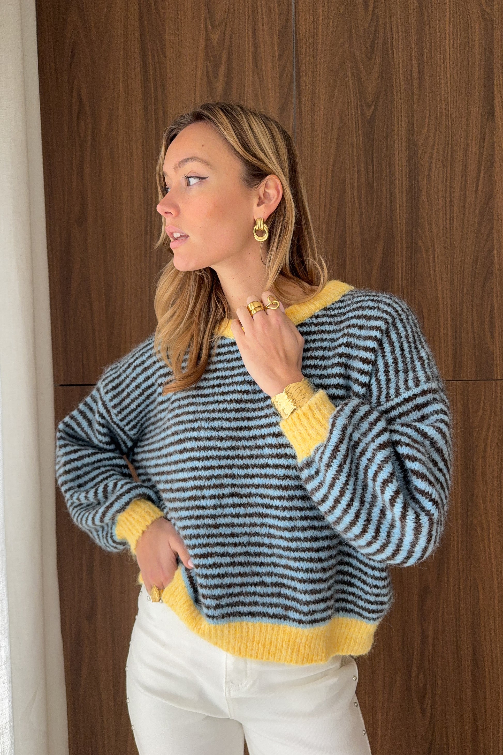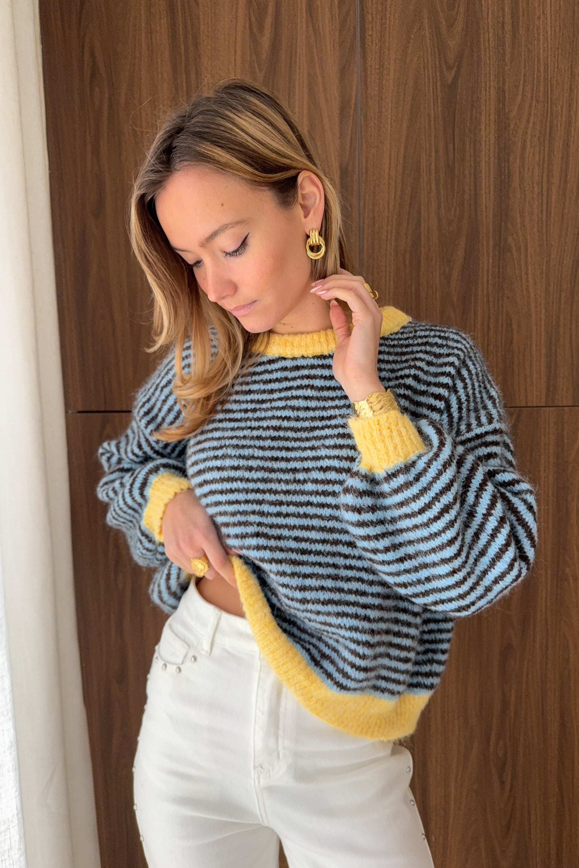 Un pull tout doux aux volumes généreux, idéal pour les journées cocooning. Ses rayures dans les tons naturels lui apportent une allure intemporelle et facile à porter.