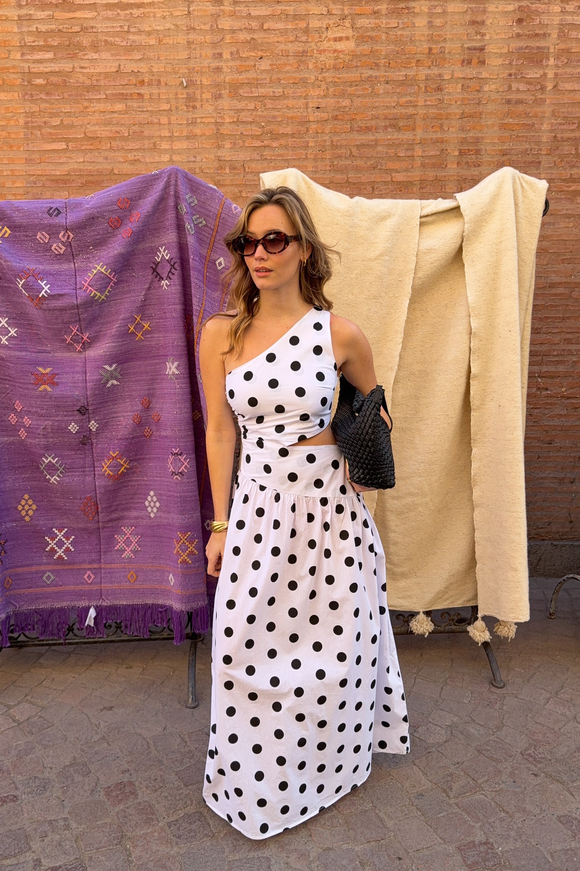 Une robe longue écrue à pois, élégante et facile à porter. Sa coupe met en valeur la silhouette, tandis que la fermeture zip sur le côté assure un enfilage pratique. La poitrine est doublée pour plus de confort.