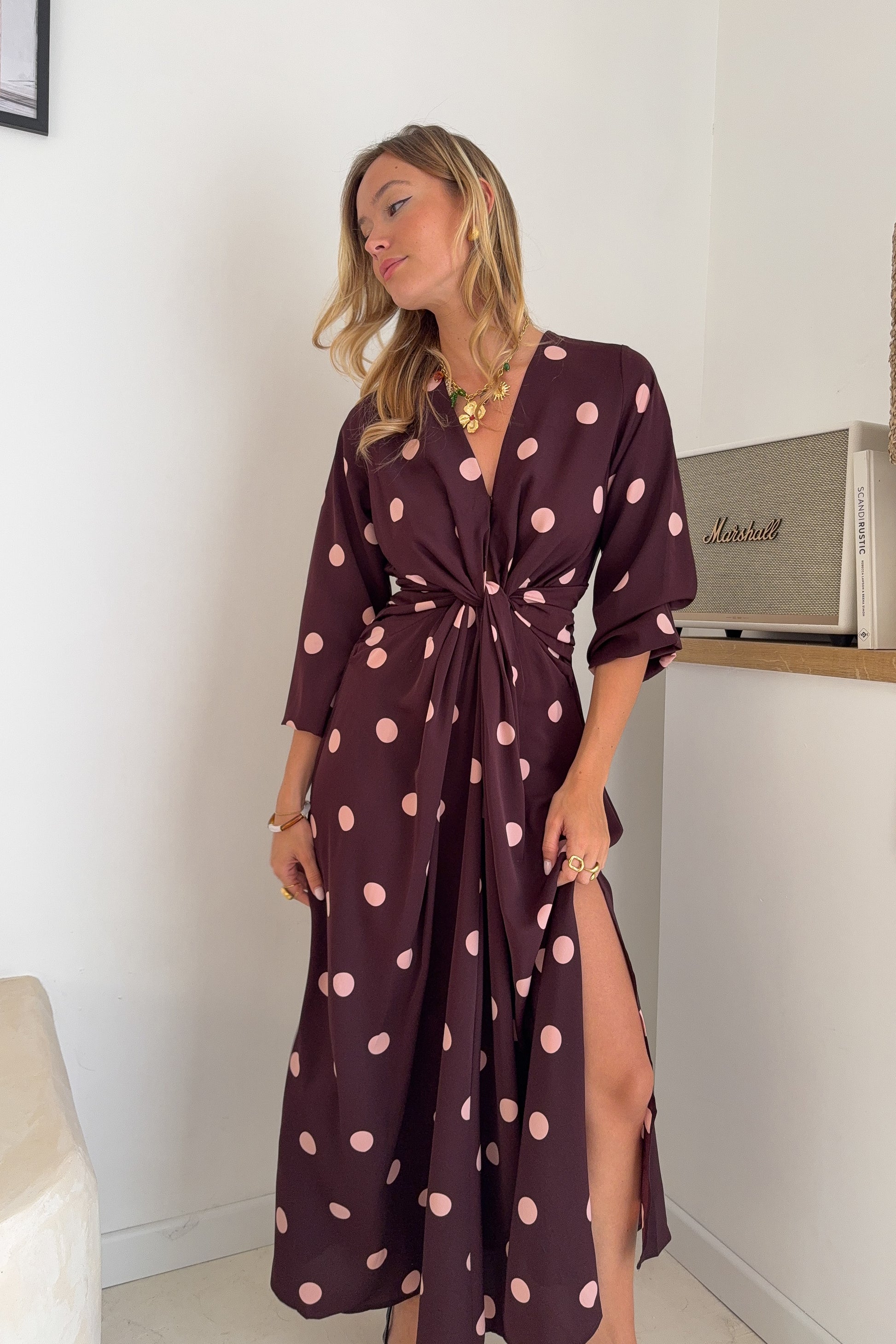 Cette robe longue bordeaux foncé se distingue par ses gros pois roses pour un style élégant. Elle possède des manches longues et une fente sur le côté qui apportent aisance et mouvement. Le bouton pression au décolleté permet un porté confortable et modulable, tandis que les jolis détails soignés soulignent la finesse de la pièce.