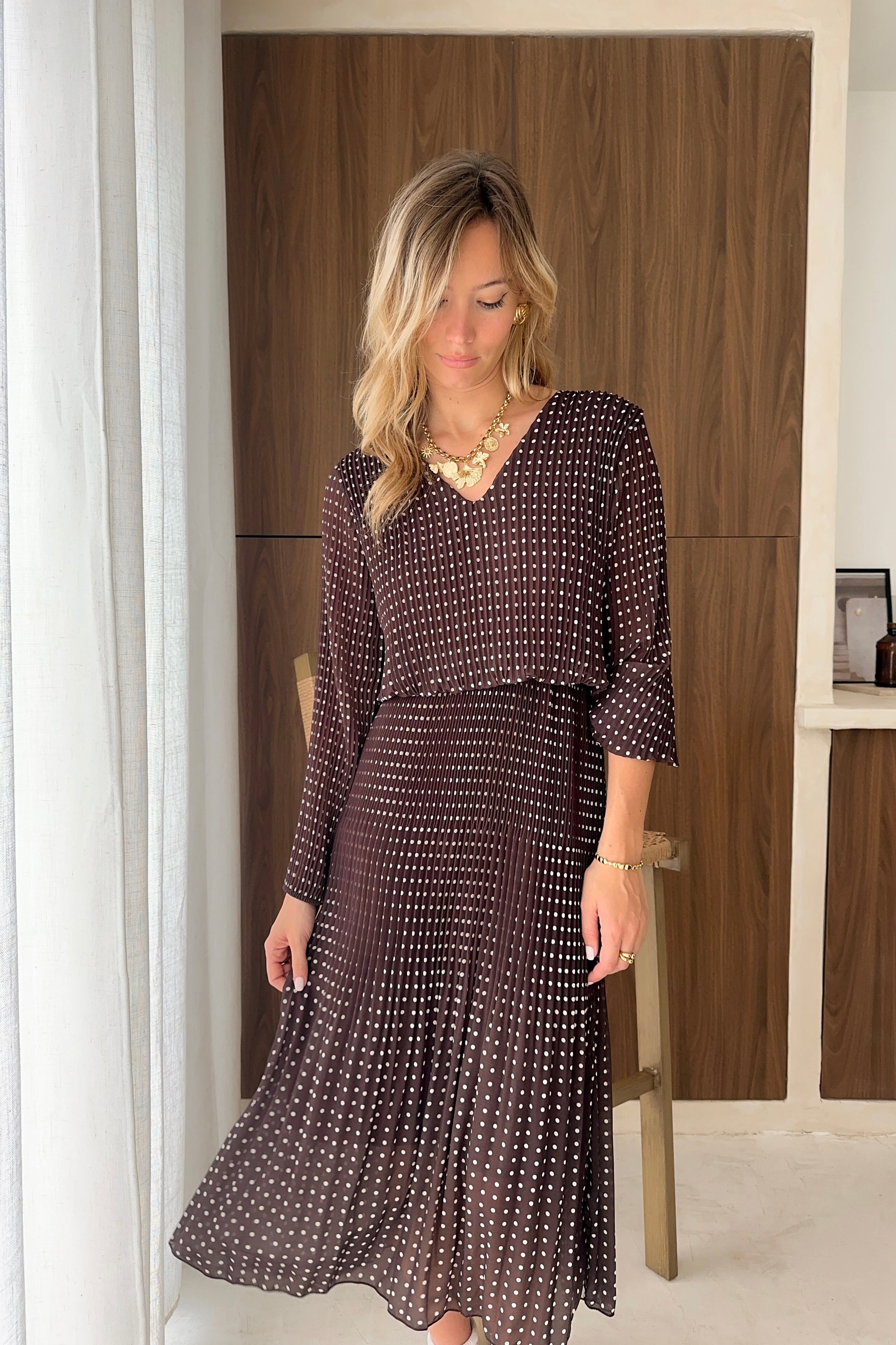 Une robe fluide et féminine, sublimée par son plissé délicat et ses pois intemporels. Sa taille élastique et sa doublure assurent un confort optimal tout en mettant joliment la silhouette en valeur.