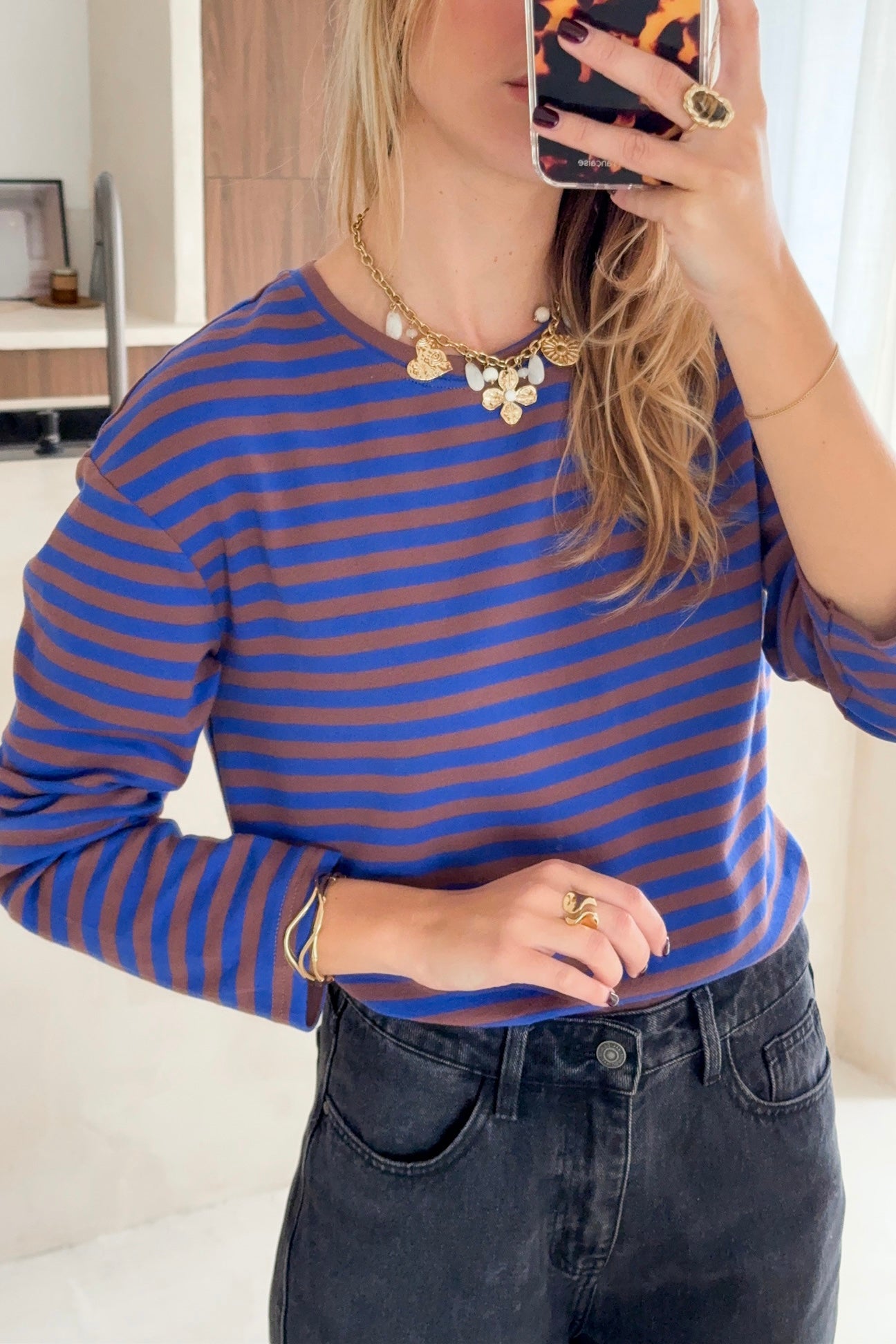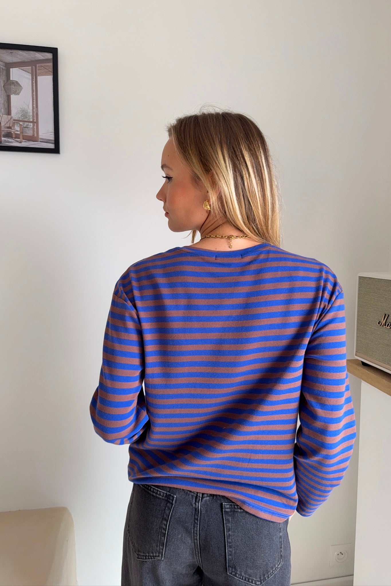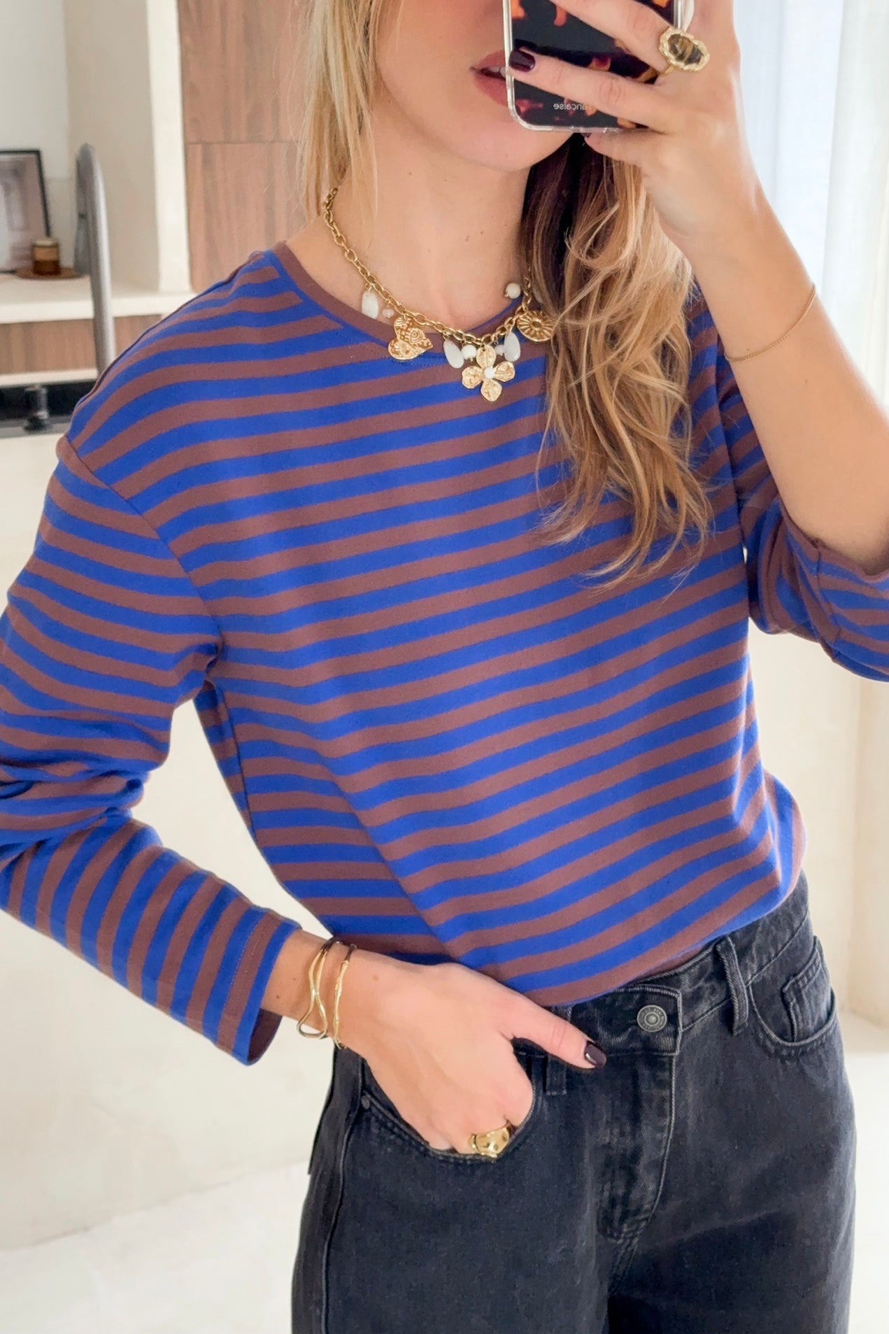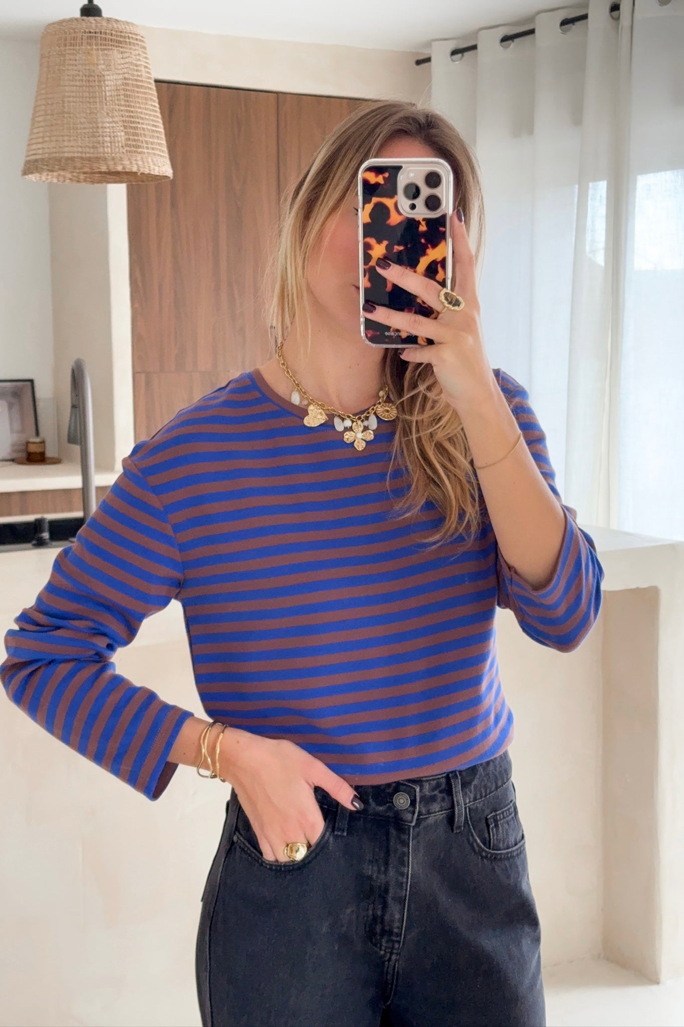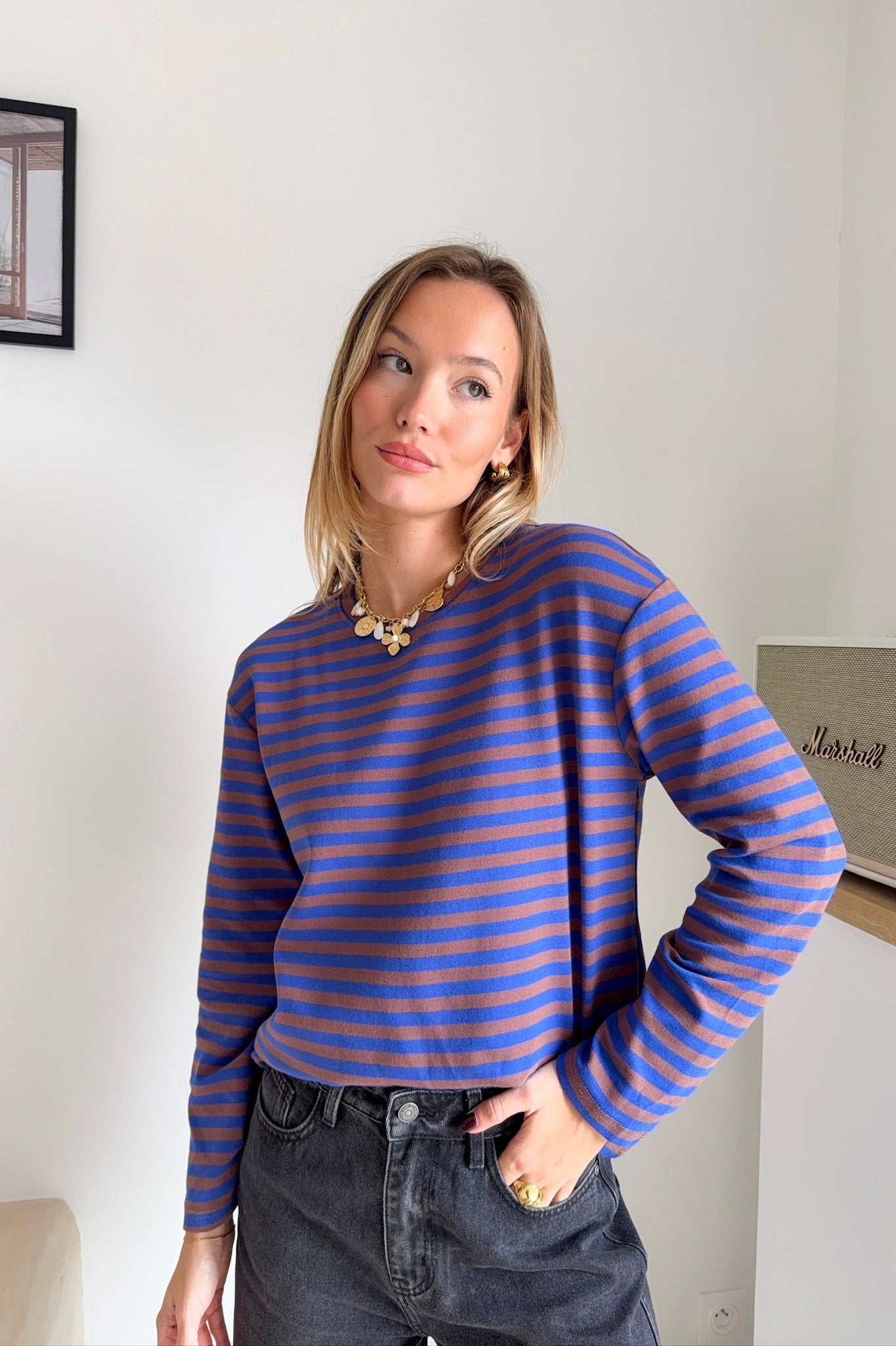 T-shirt rayé aux tons marron et marine, un basique revisité pour un style graphique et moderne. Confortable et doux, il s’associe facilement avec un jean ou une veste pour créer un look casual chic.