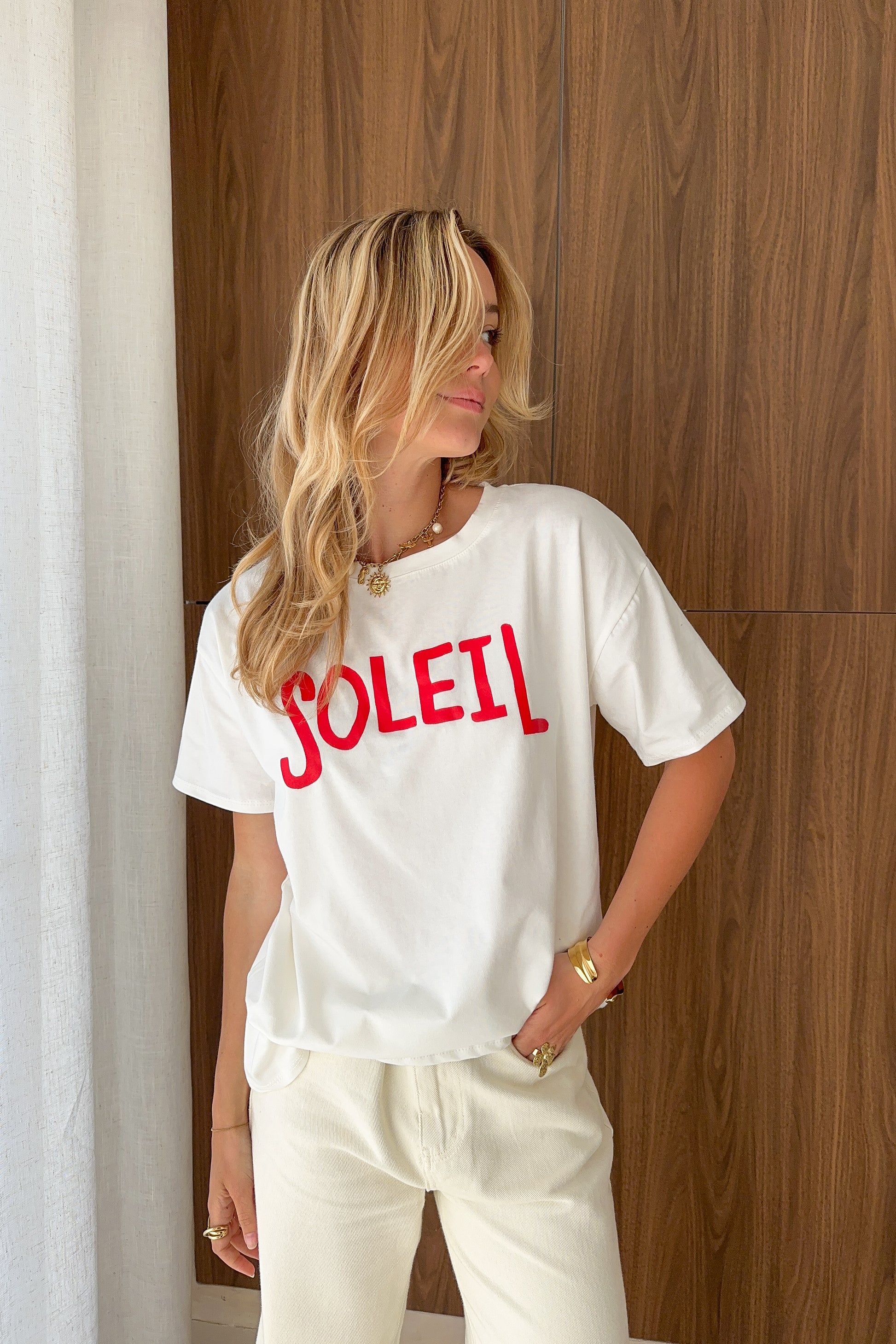 Ce t-shirt écru mise sur les détails qui font la différence : un sublime imprimé soleil dans le dos pour rayonner en toute simplicité, et une inscription "soleil" en rouge à l’avant pour une touche graphique affirmée. Une pièce douce et lumineuse, facile à porter au quotidien.