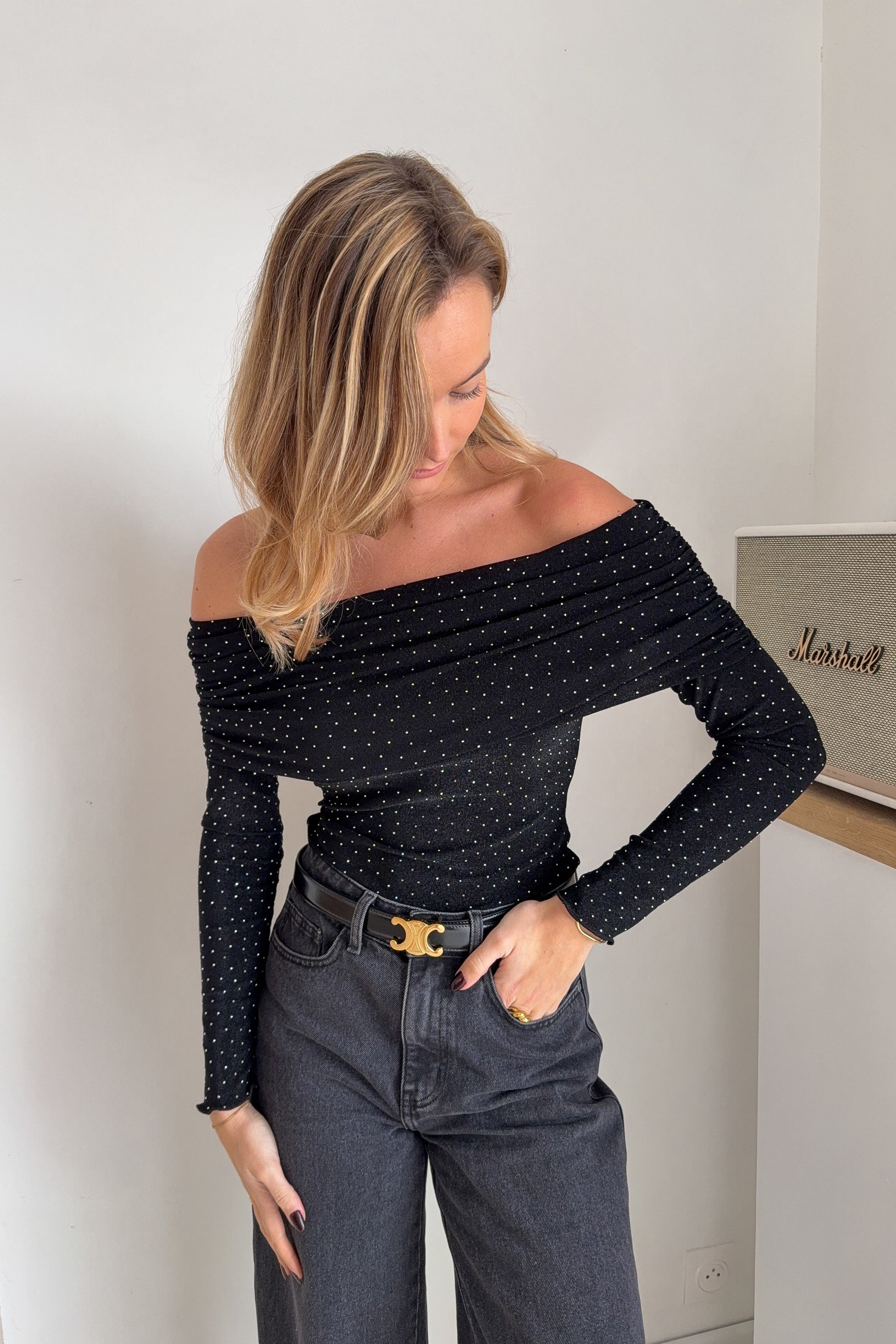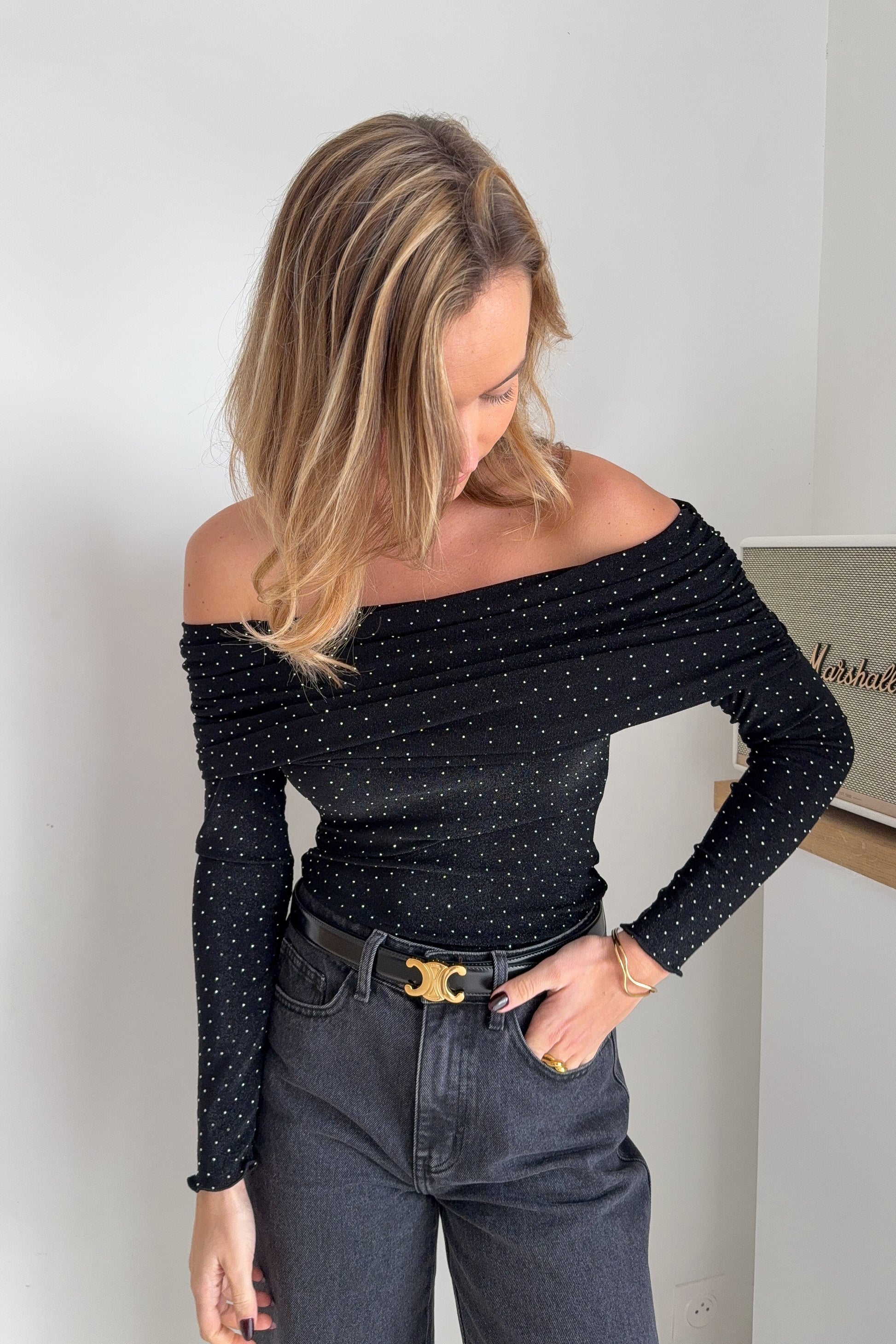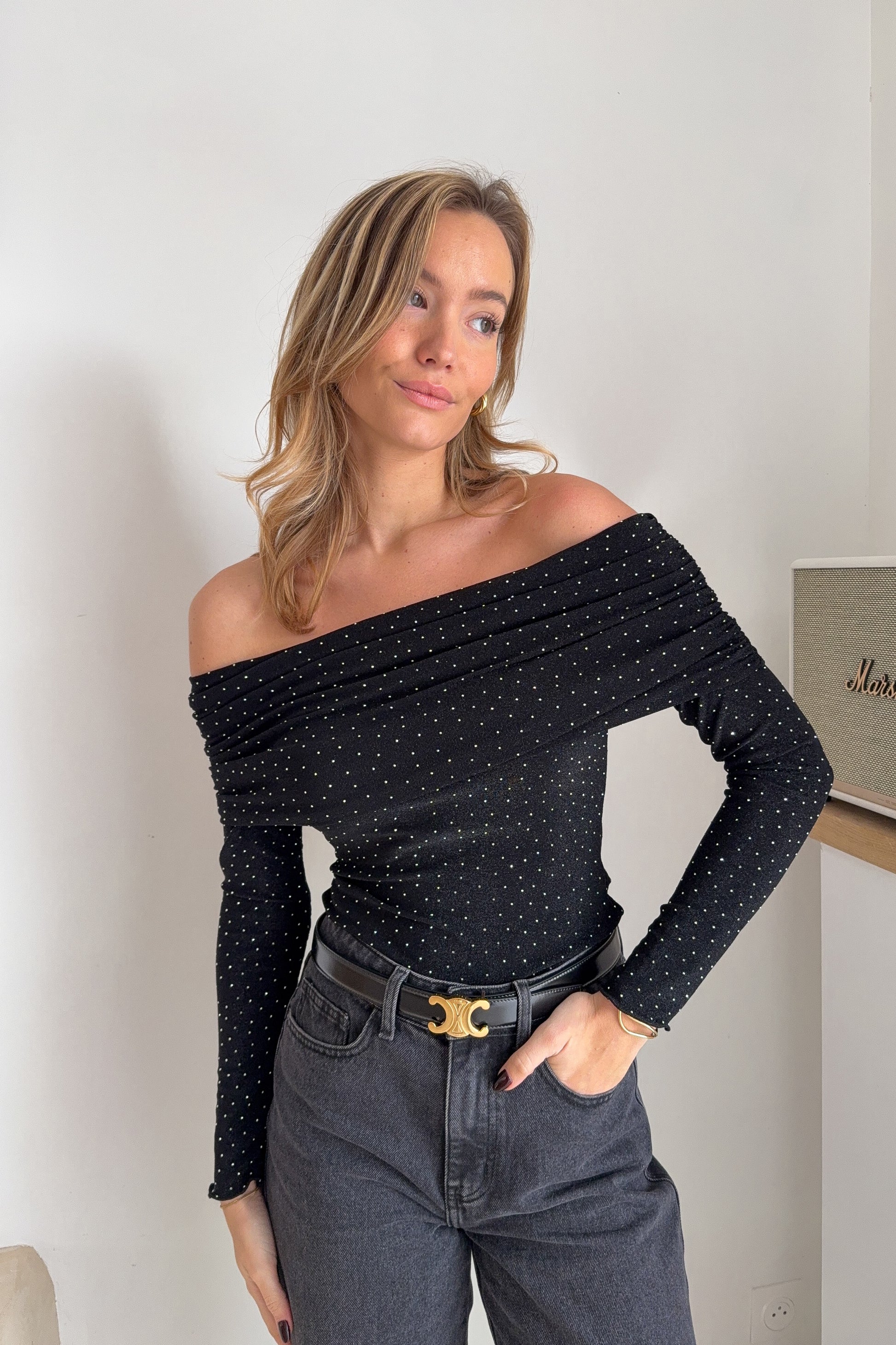 Top noir élégant avec col Bardot qui dégage délicatement les épaules et apporte une touche particulièrement féminine. Orné de strass scintillants sur le devant, il offre un rendu chic et lumineux.