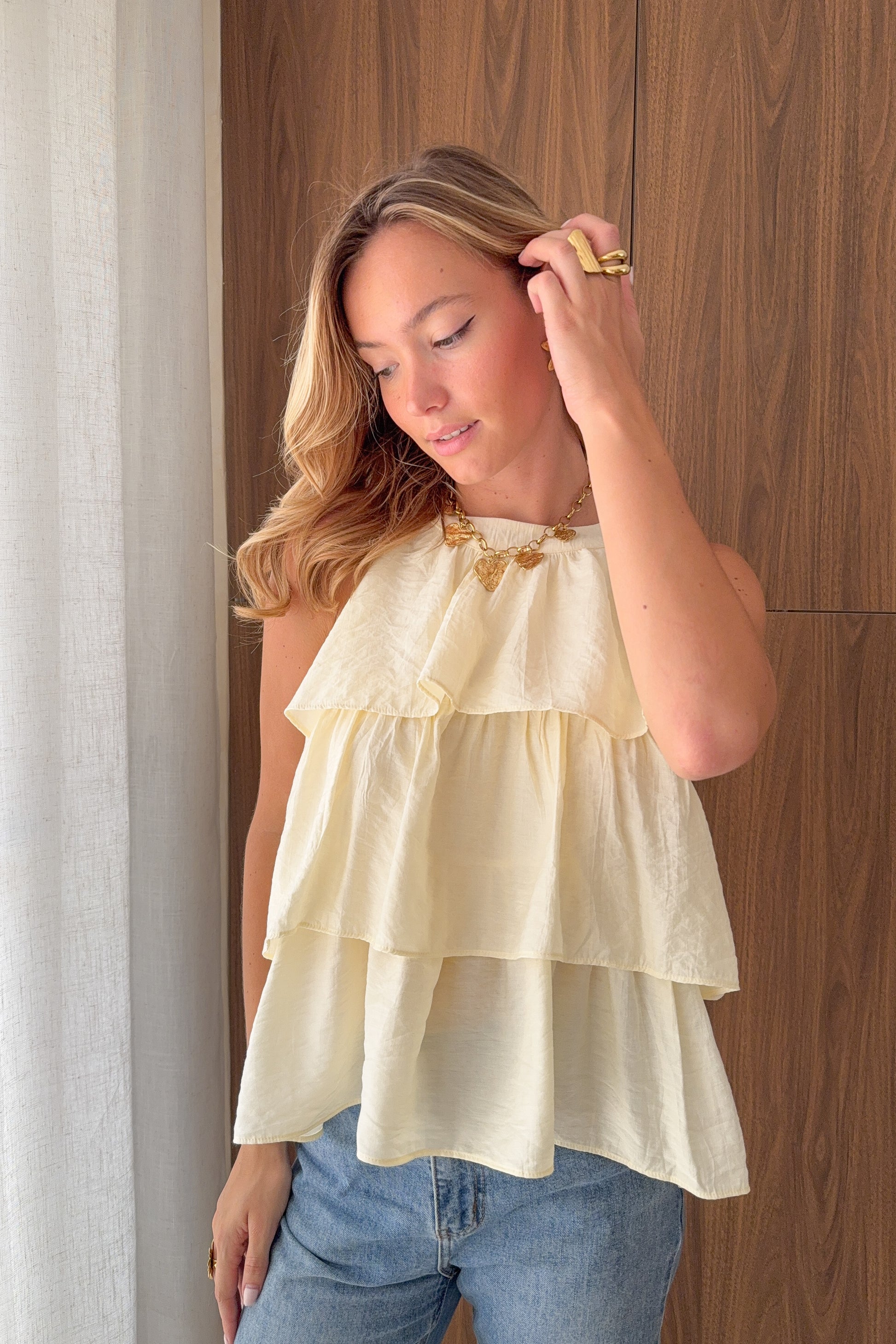 Ce top jaune à volants lumineux apportera une touche de fraîcheur à votre tenue !