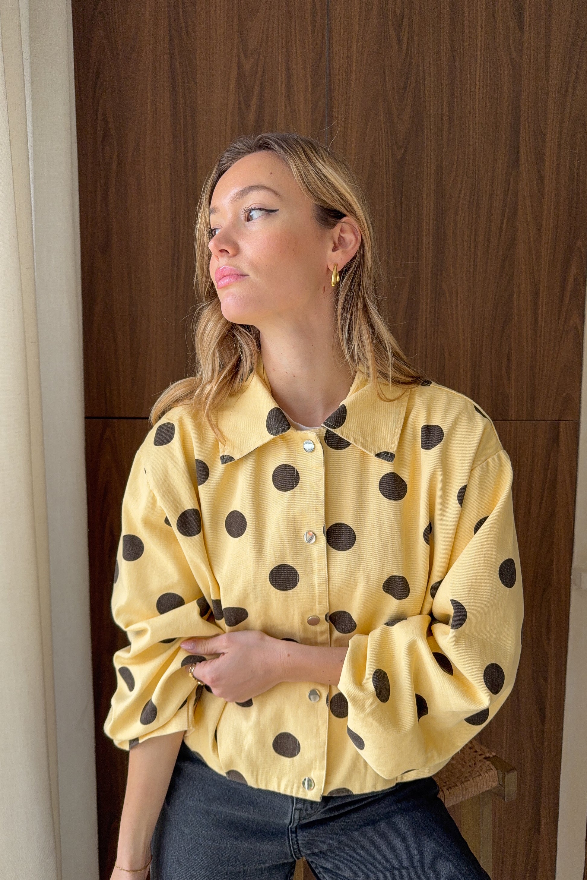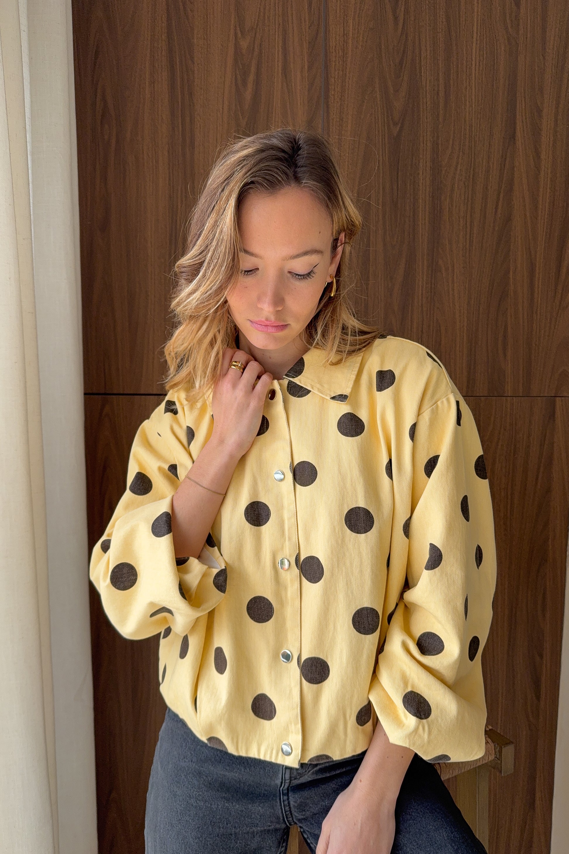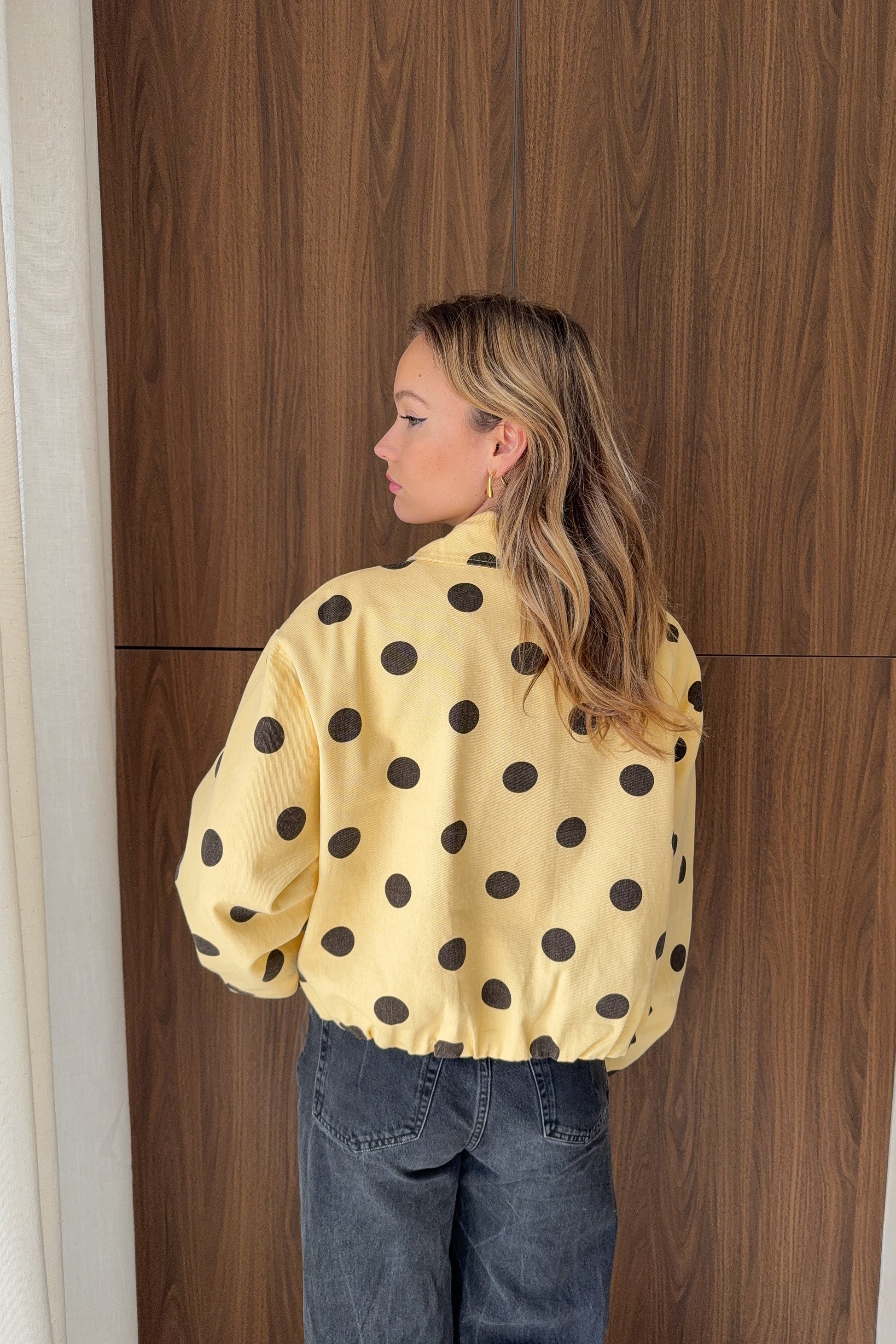 Une veste doublée dans un jaune pâle délicat, sublimée par un motif à pois et de jolis volumes. Une pièce originale et facile à porter.