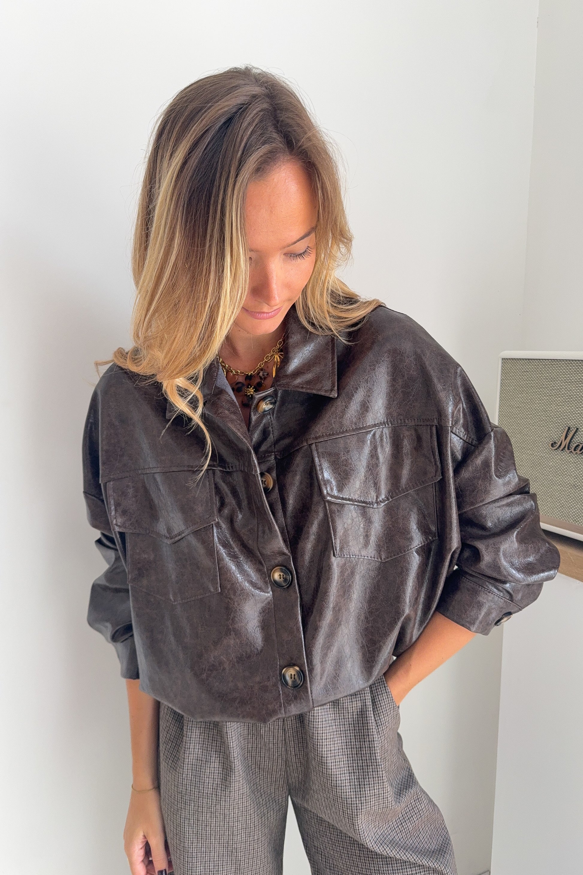 Veste simili cuir marron foncé avec effet cuir vieilli, apportant style et caractère à vos tenues.