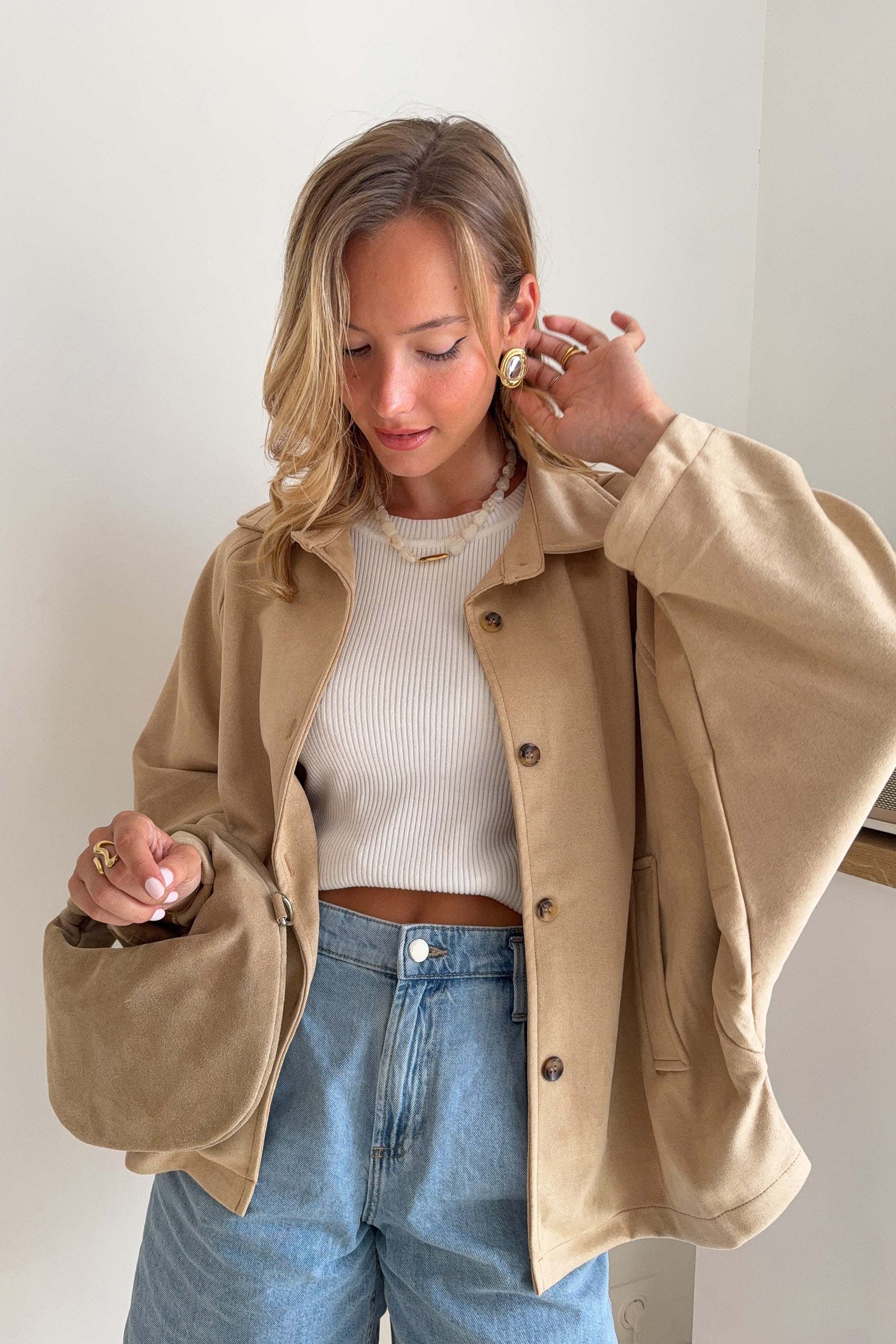 Cette veste camel associe style et confort avec son bel effet daim et sa coupe moderne. Ses manches au volume subtilement travaillé lui donnent une allure tendance, tandis que ses deux poches à l’avant ajoutent une touche pratique et décontractée. Confectionnée en Italie en 100% polyester, elle se distingue par sa douceur et sa facilité d’entretien. Taille unique, elle s’adapte aisément à différentes morphologies.