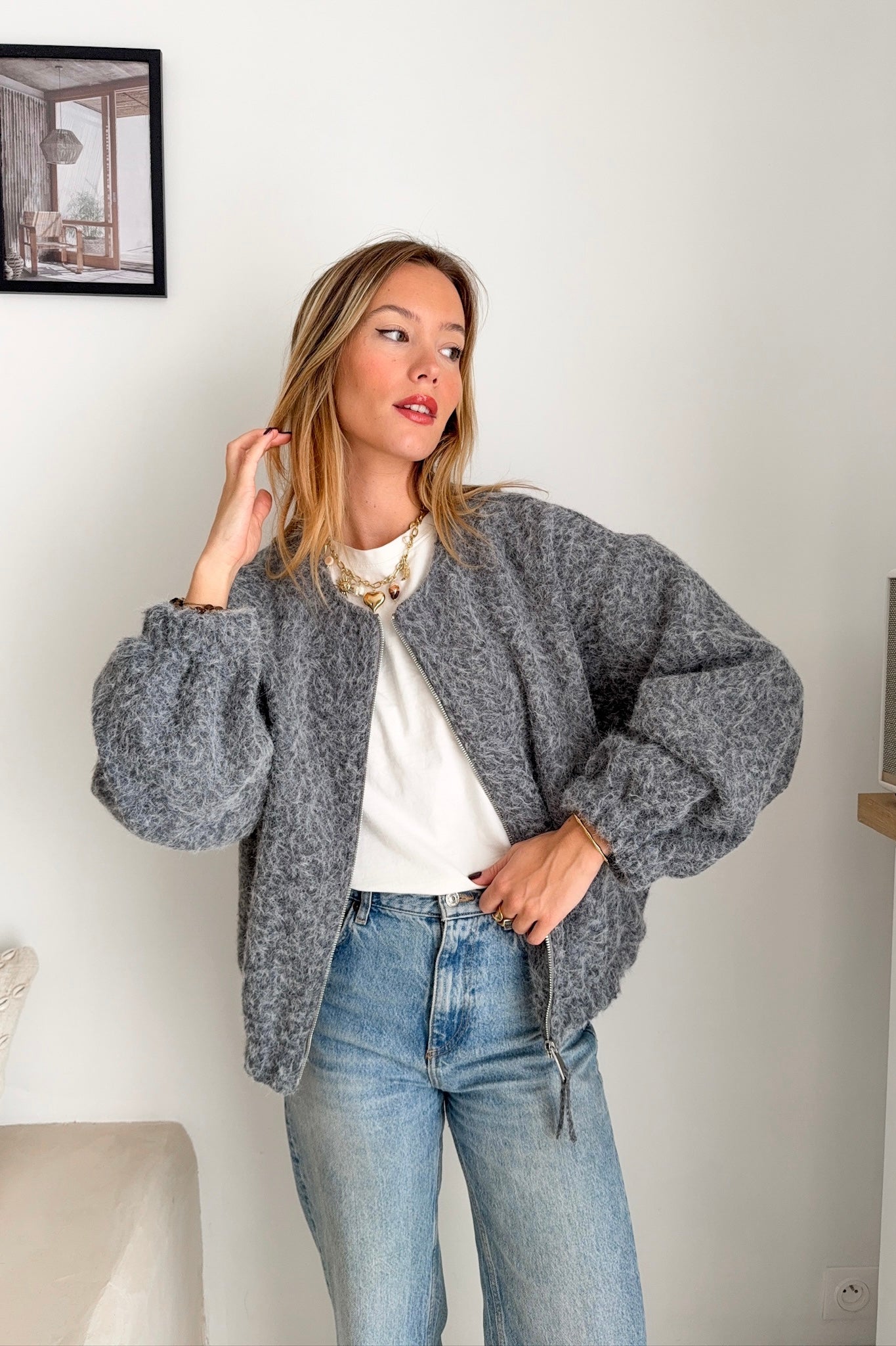Veste élégante et confortable, confectionnée dans une matière ultra douce. Son coloris gris intemporel et ses volumes sublimes en font une pièce idéale pour un look moderne et cocooning. Fermeture par zip pratique à l’avant.