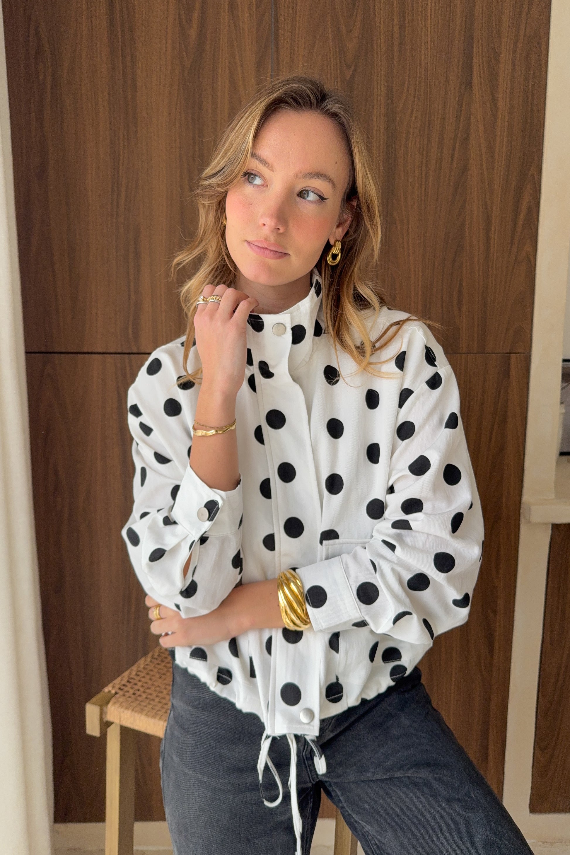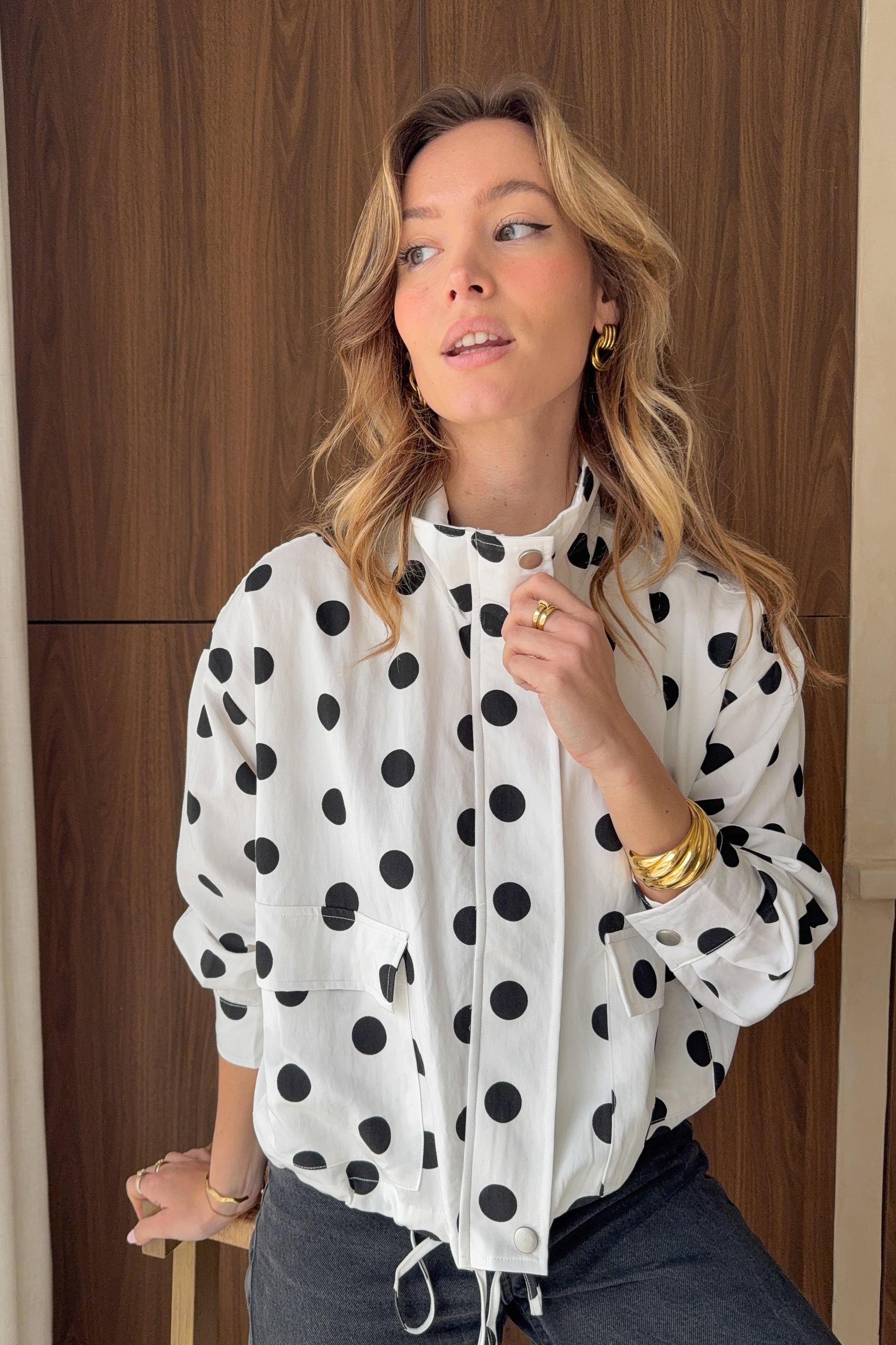 Une veste légère et élégante, écrue à pois noirs, parfaite pour structurer une tenue tout en restant facile à porter. Son col légèrement montant, sa fermeture zip complétée de boutons et ses poches avant apportent confort et style au quotidien.