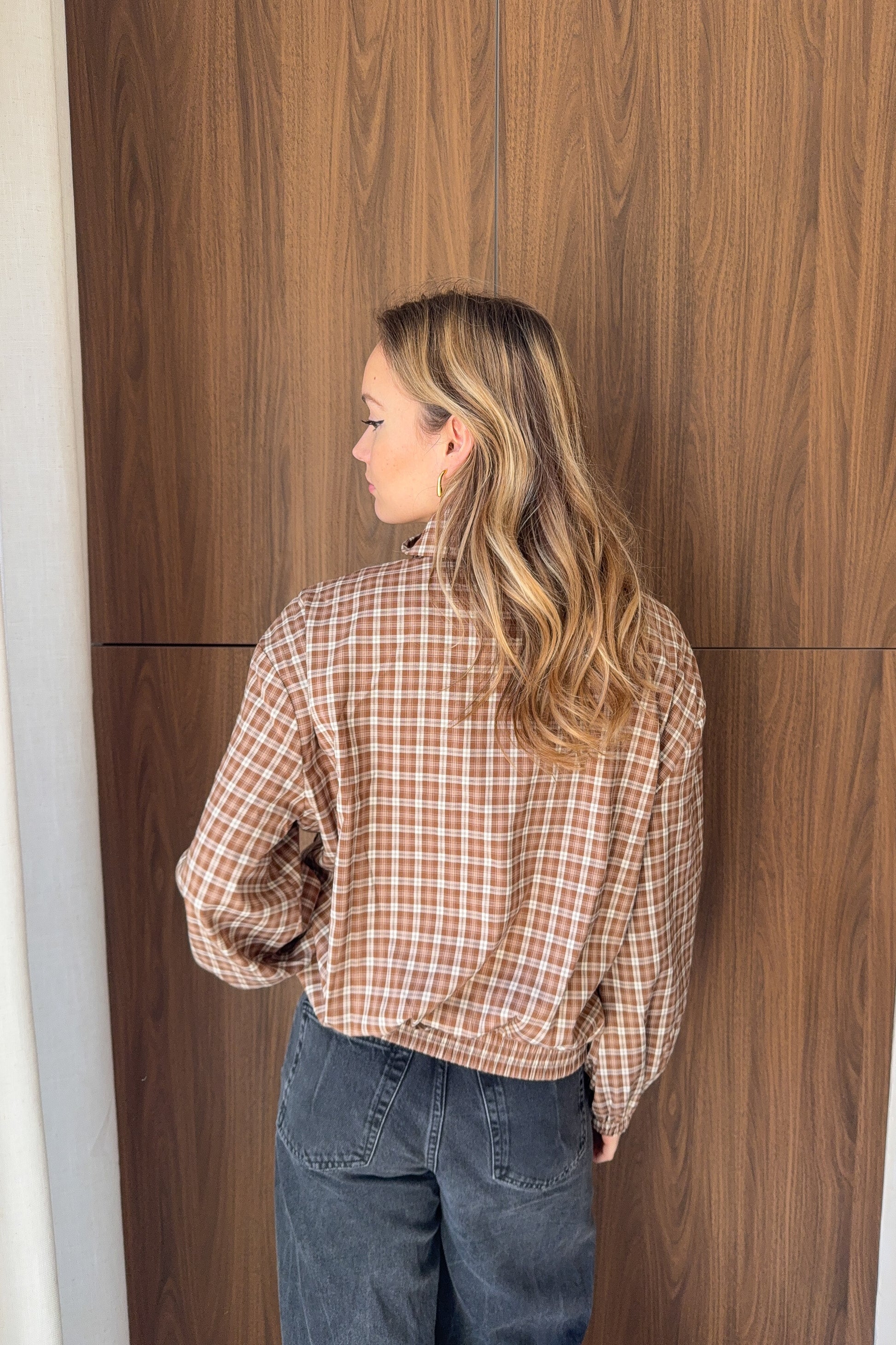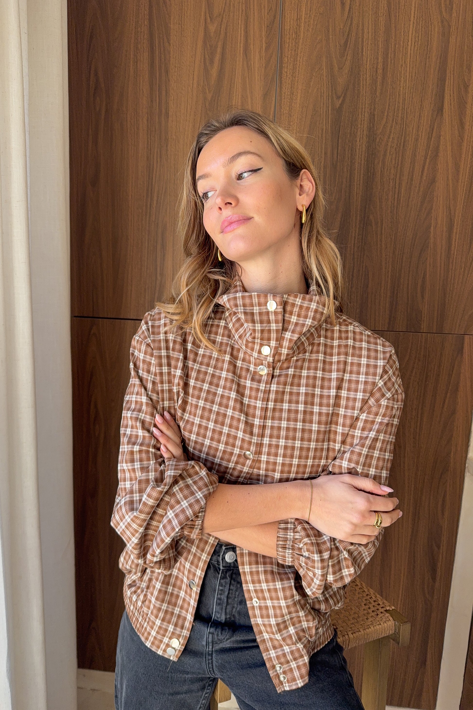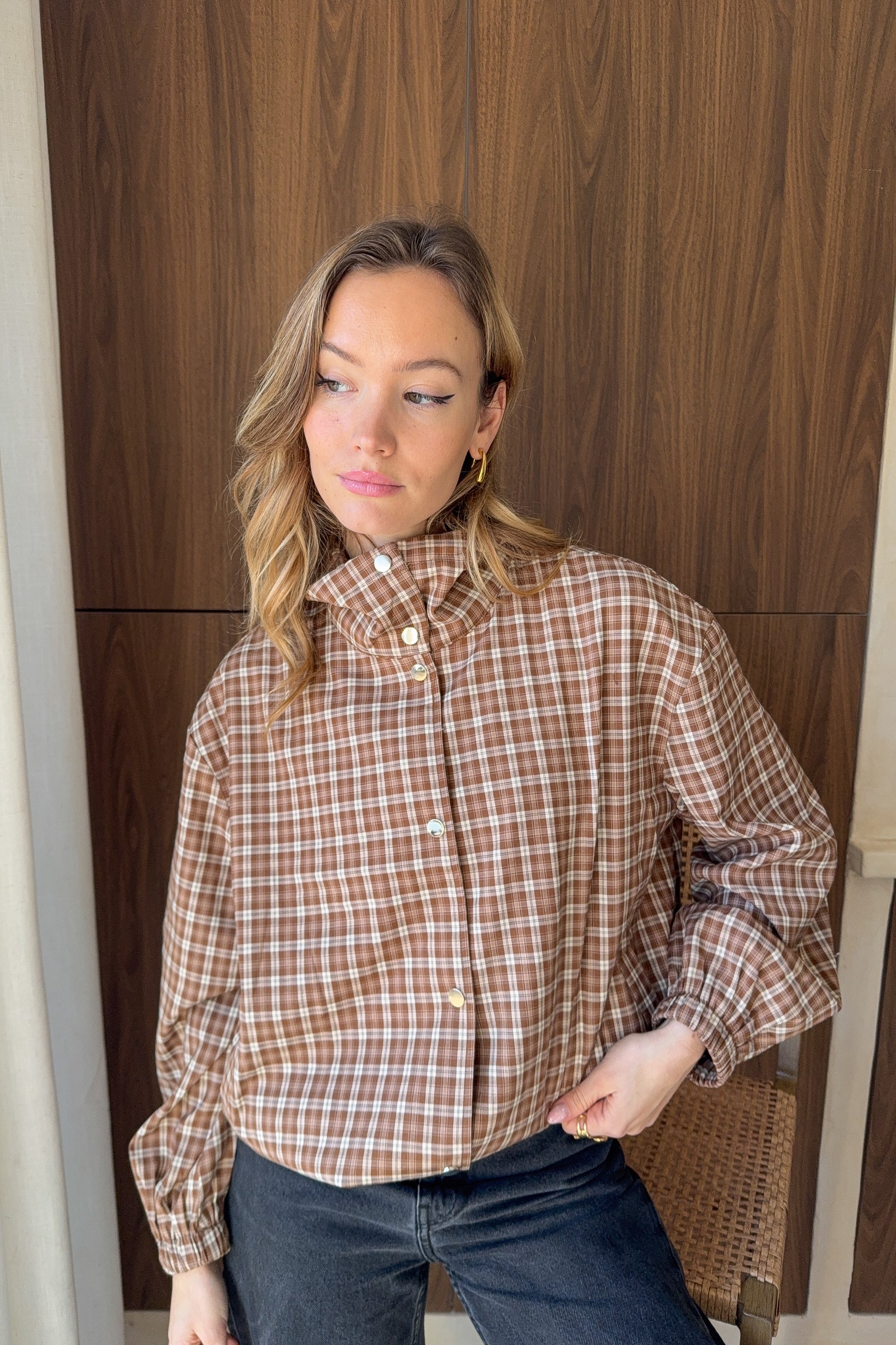 Une veste légère doublée à motif carreaux dans de jolis tons marron. Son col montant et sa fermeture par boutons pression apportent une touche moderne, tandis que le bas resserré structure joliment la silhouette. Une pièce facile à porter au quotidien.