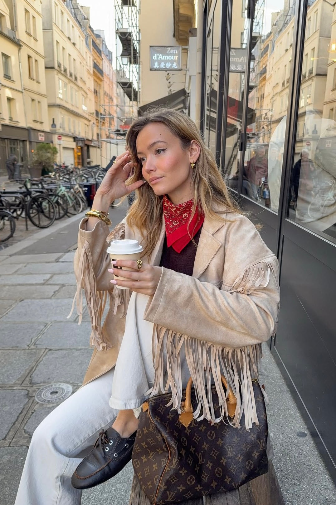 Veste beige effet daim – Détails franges