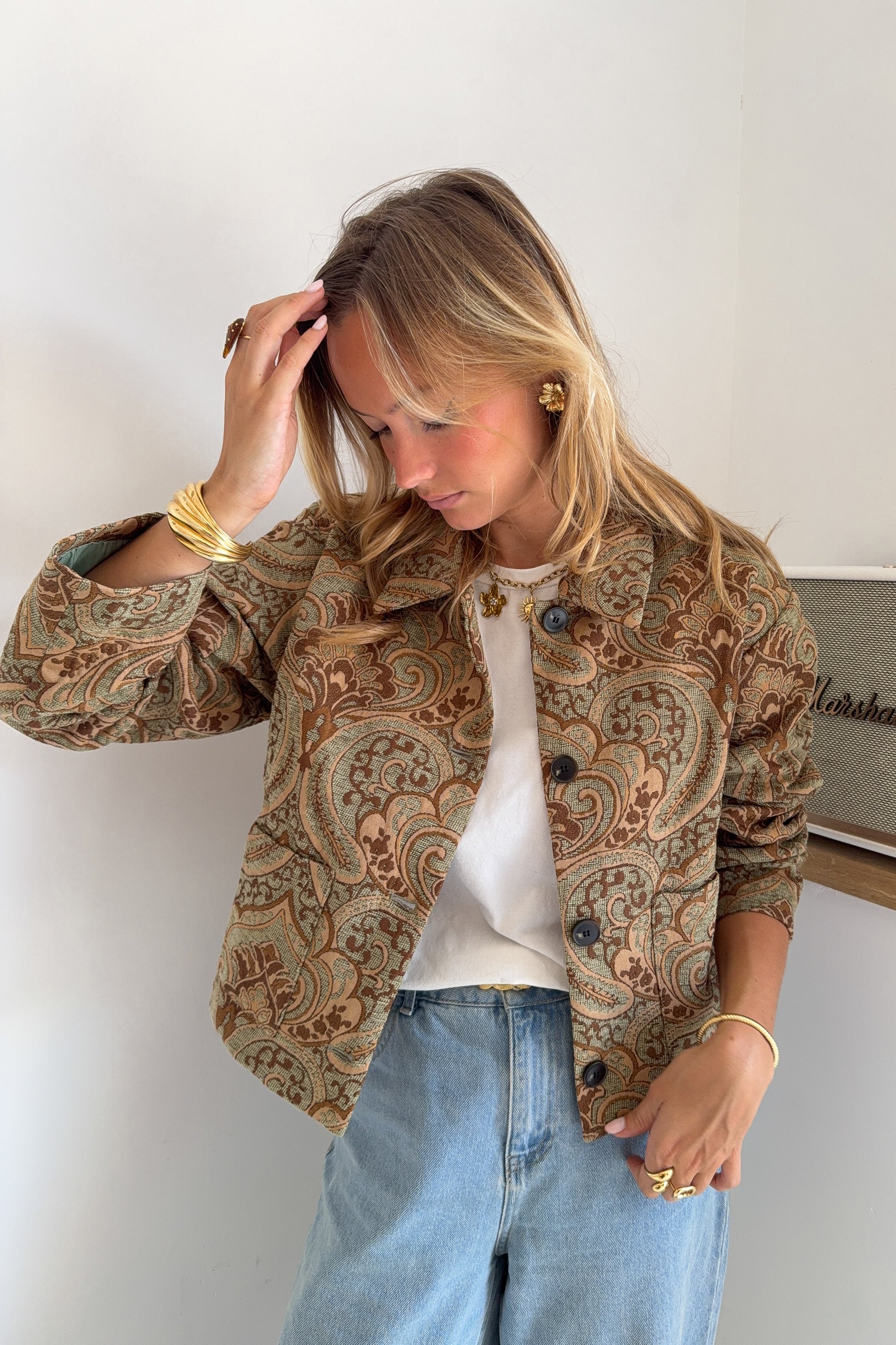 Originale et raffinée, cette veste courte dans les tons verts séduit par ses motifs baroques et ses détails soignés. Ses petites poches plaquées sur le devant et ses boutons marron apportent une touche authentique, tandis que sa coupe structurée et sa doublure assurent confort et maintien. Une pièce forte à porter aussi bien avec un jean qu’un pantalon habillé.