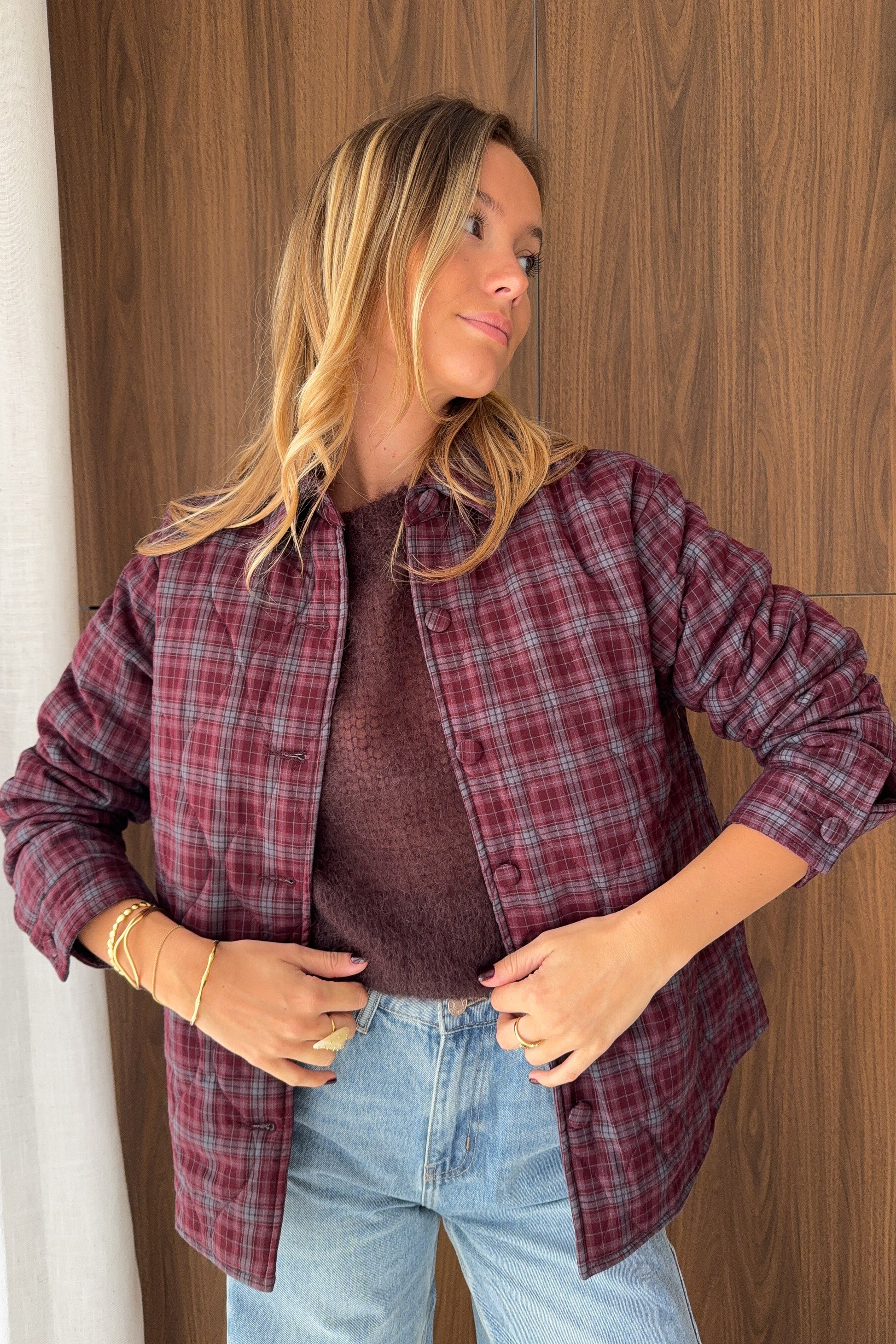 Veste à carreaux dans les tons bordeaux et bleu, élégante et confortable grâce à sa doublure. Boutons recouverts pour une finition soignée. Idéale pour un look chic et moderne au quotidien.