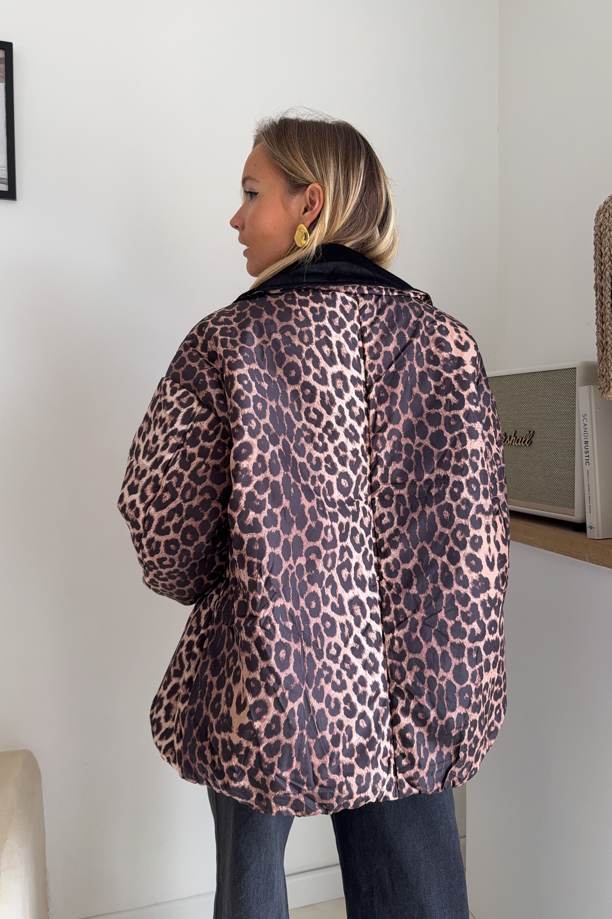 Veste effet doudoune à motif léopard, légère et confortable, idéale pour vos looks casual et urbains. Fermeture par zip argenté et deux poches devant pour plus de praticité et de style.